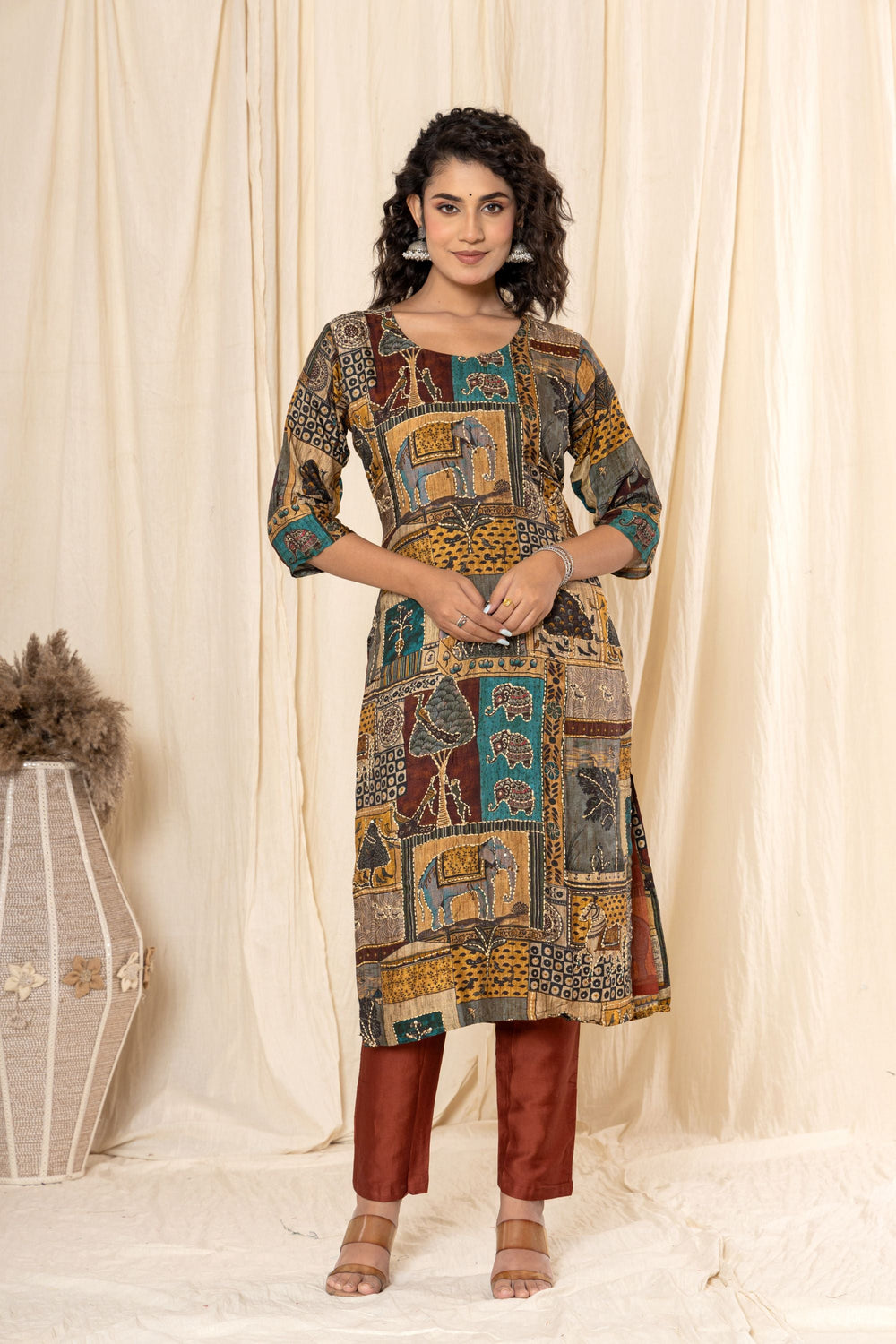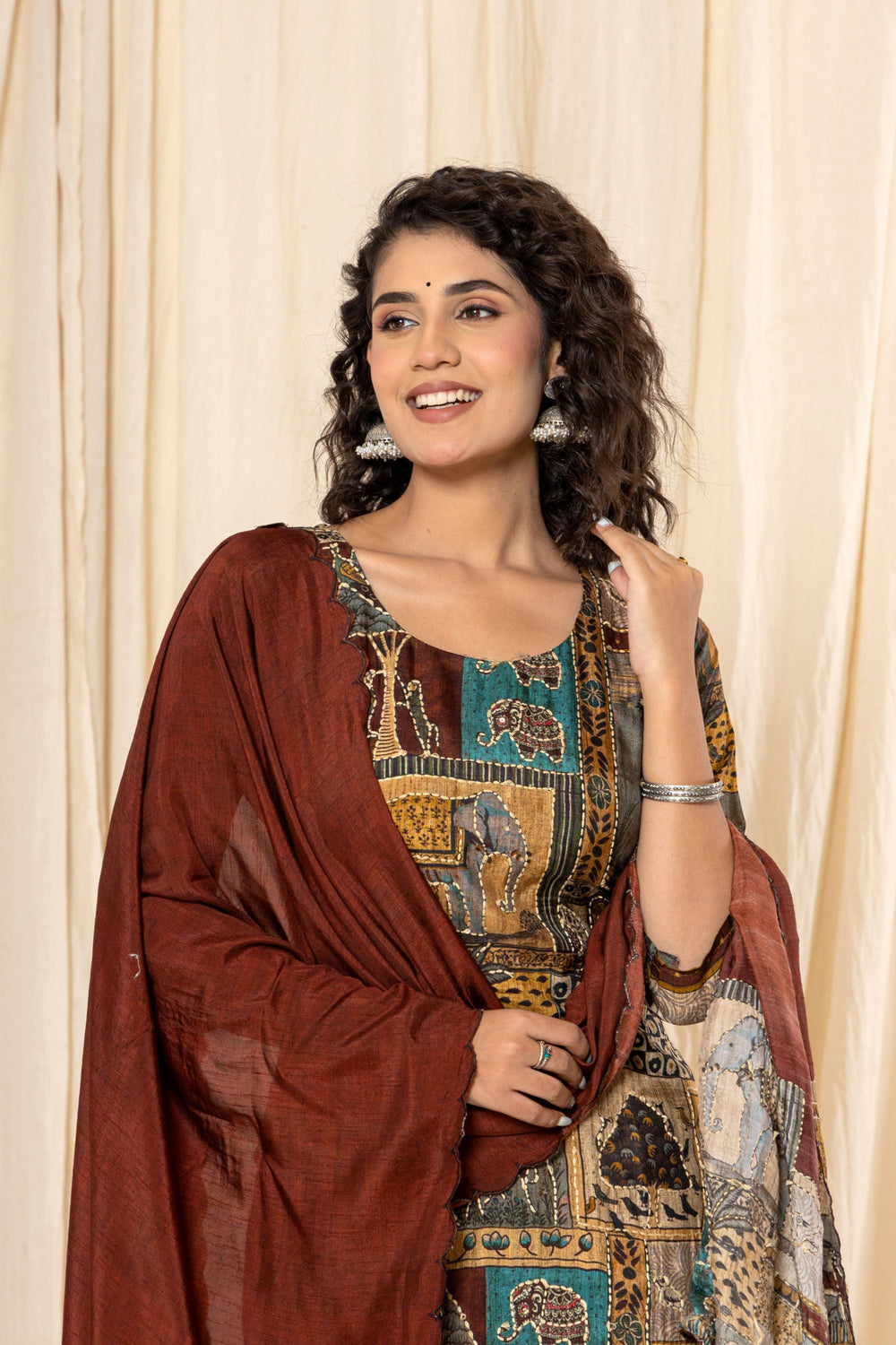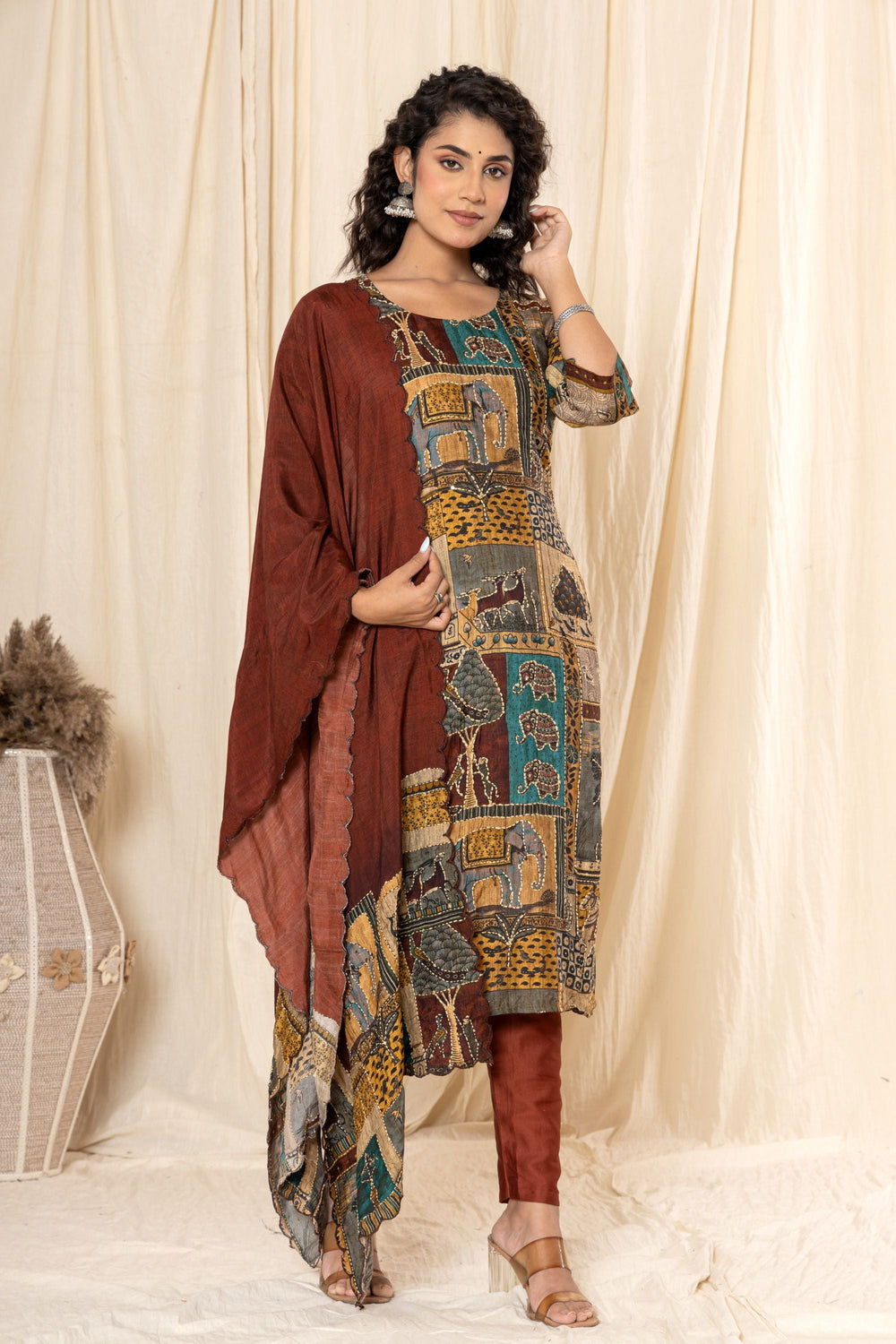 Make a gorgeous statement in theFigure Folk Print Cotton Silk Suit Set. Crafted from the most luxurious cotton silk fabrics, adorned with colorful Figure prints and a hand katha embroidered work. The relaxed fit kurta has an straight line silhouette, and three-quarter stylized sleeves. It is paired with embroidered Dupatta with cut work.