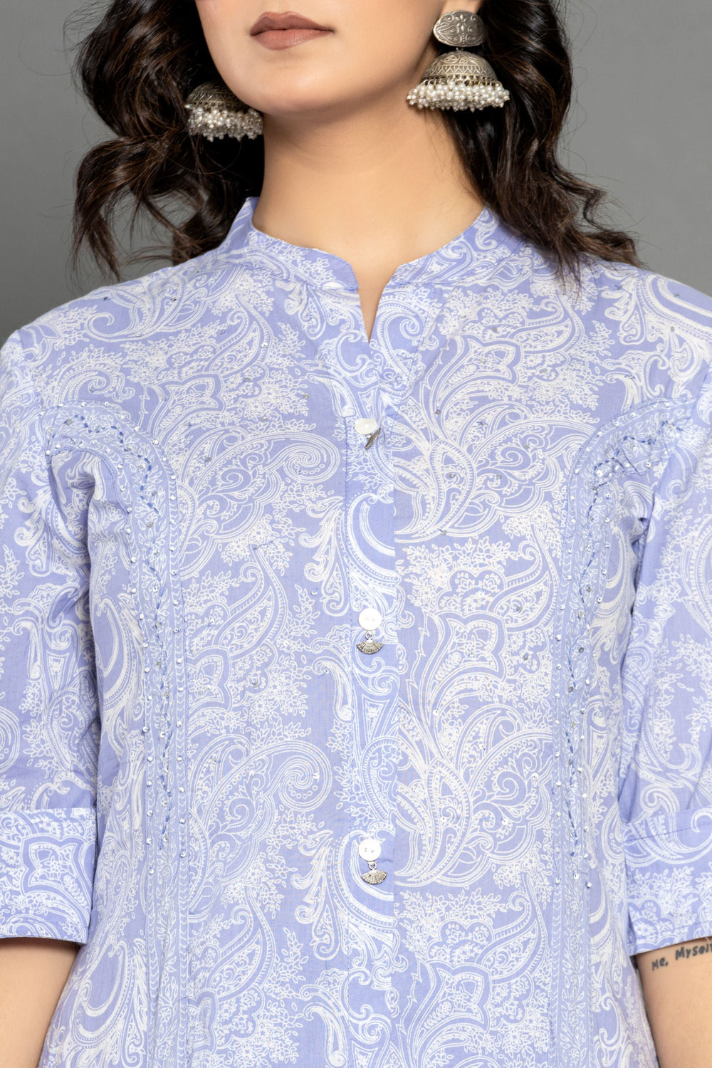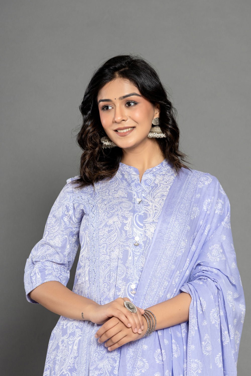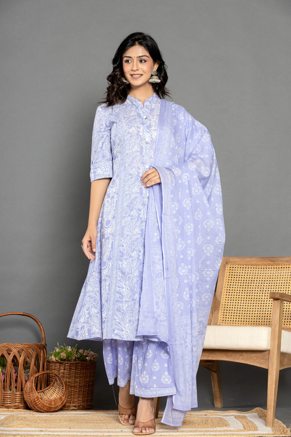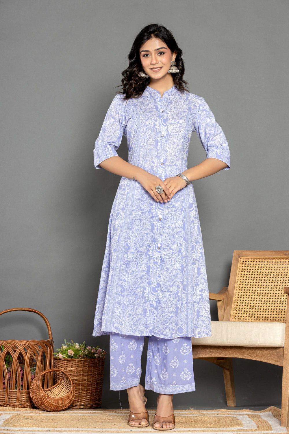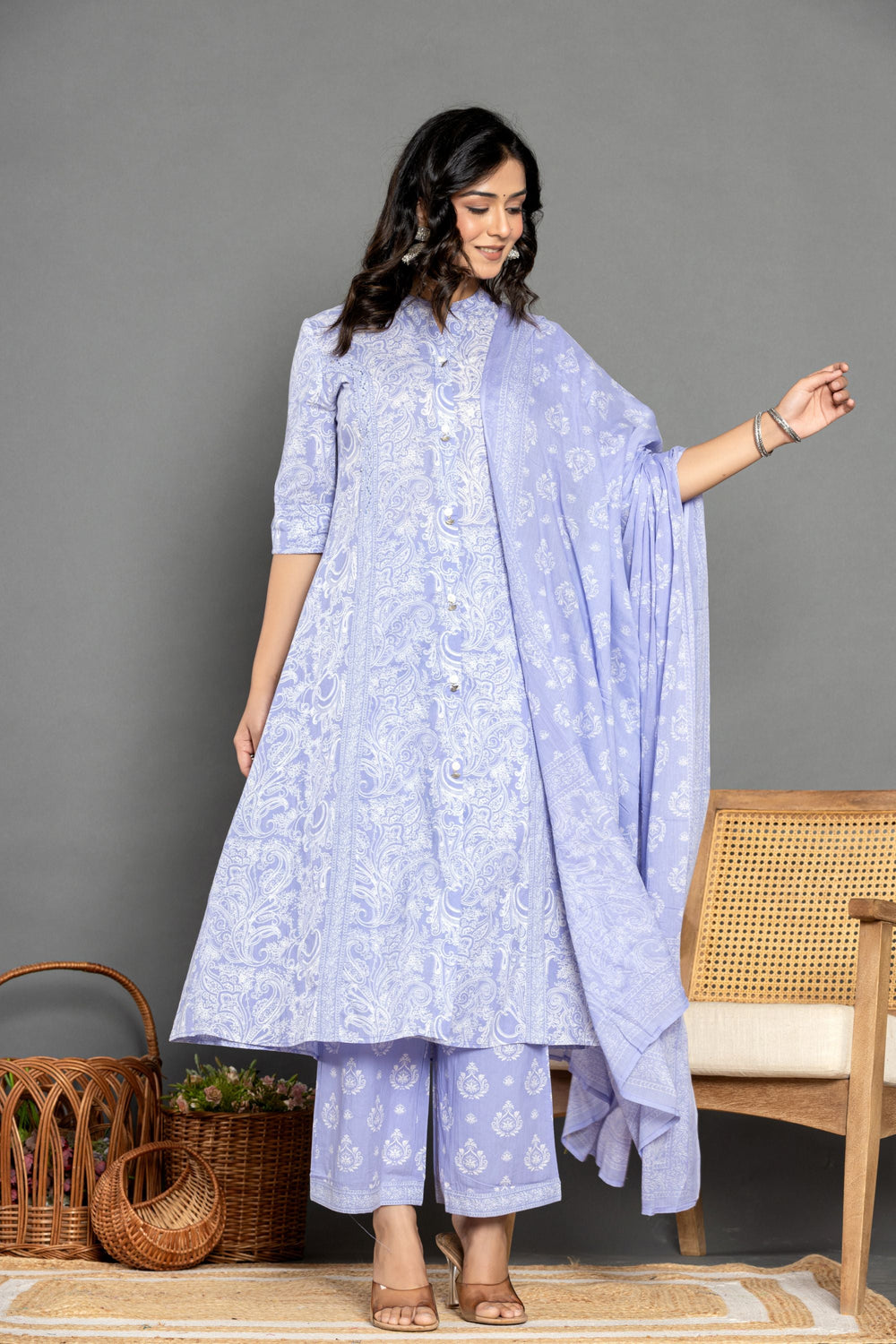 Add a touch of romance and femininity to your wardrobe with this beautiful Heather Purple A Line Suit Set. The vibrant white print design on the bright purple base is designed to make you feel like you're walking through a field of flowers, even when you're in the heart of the city.