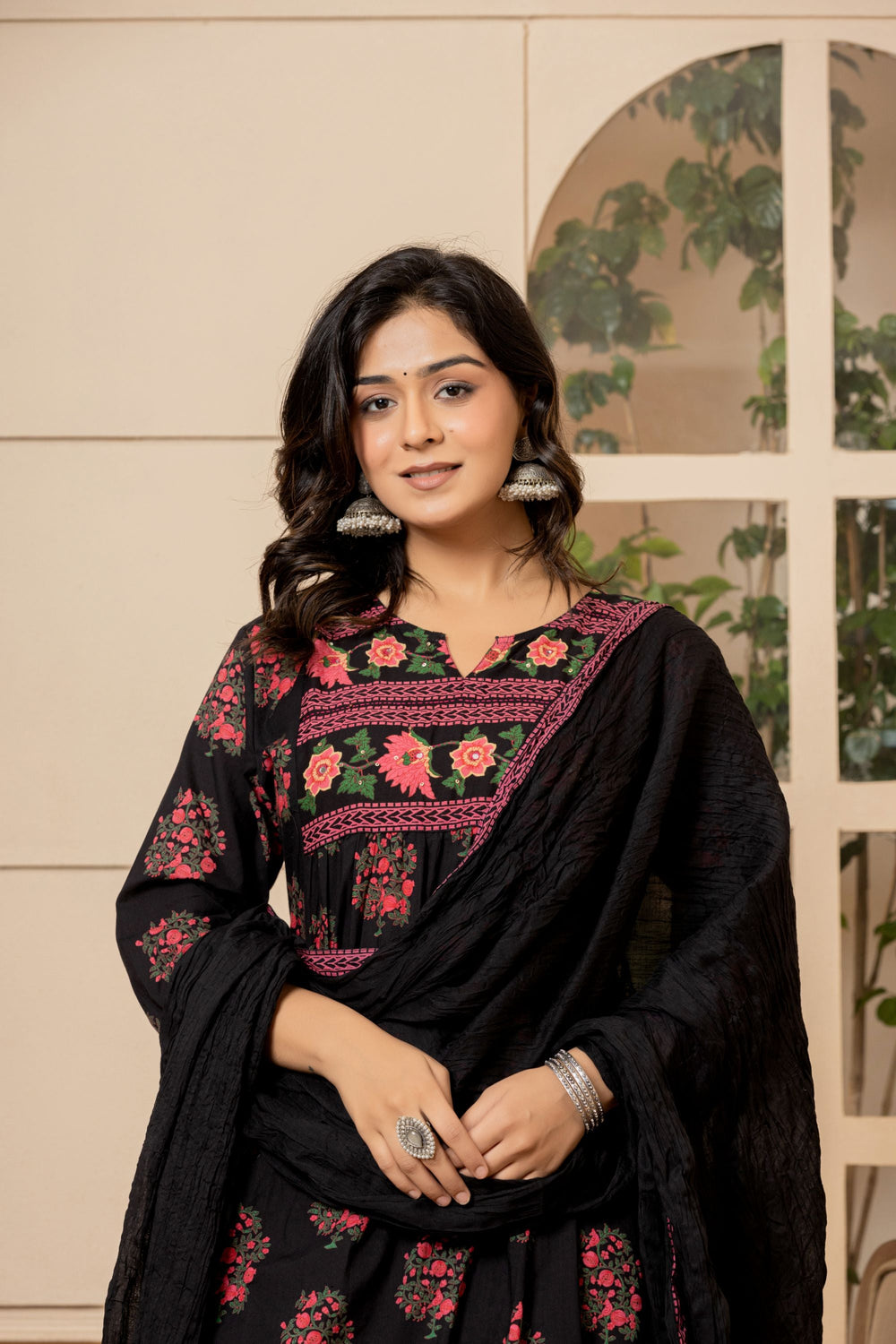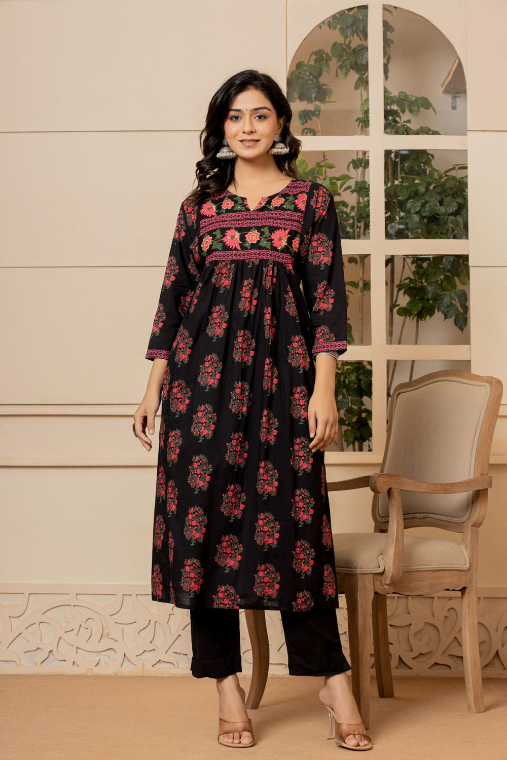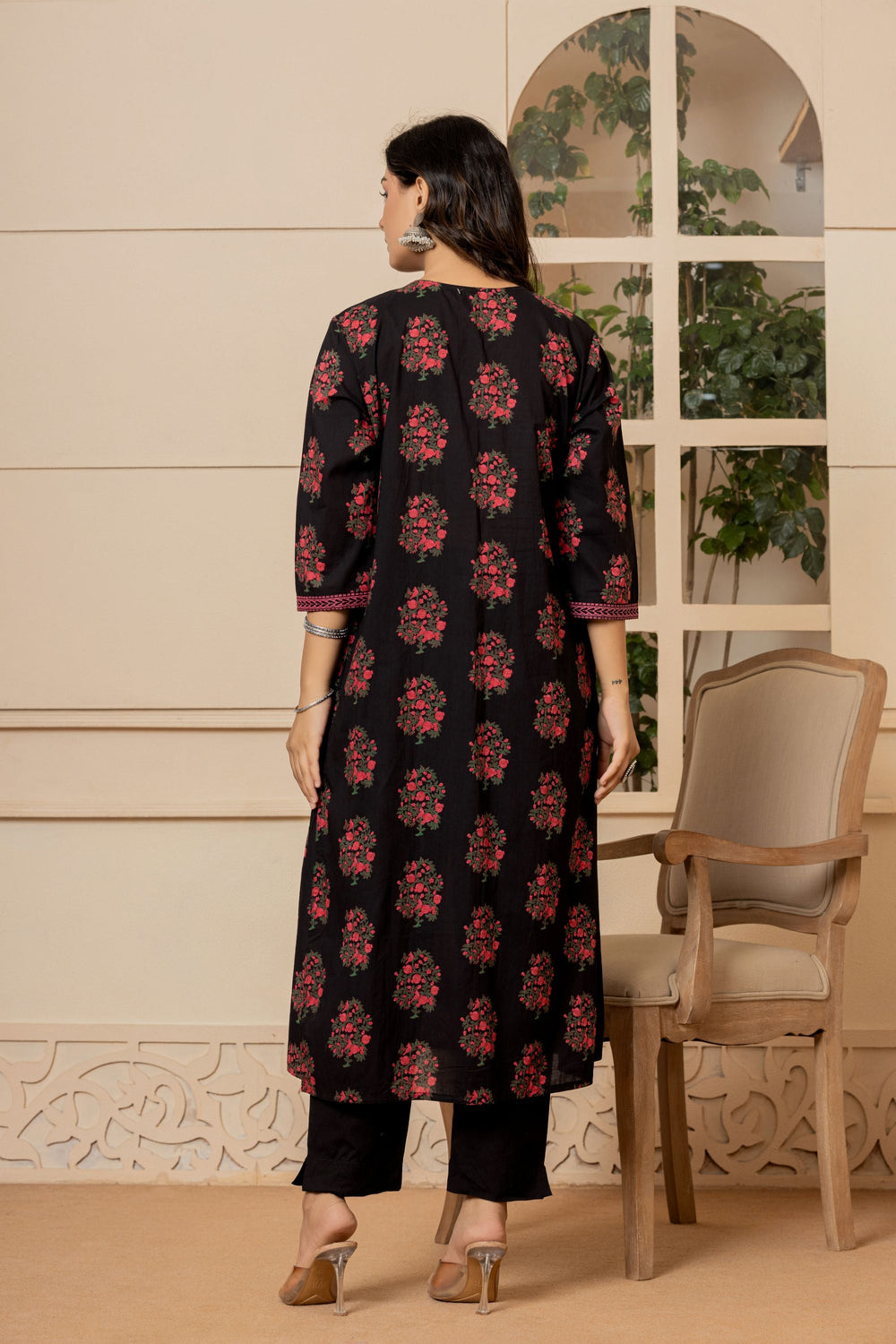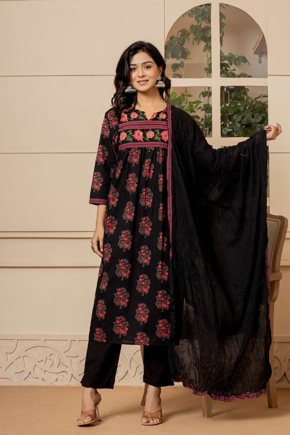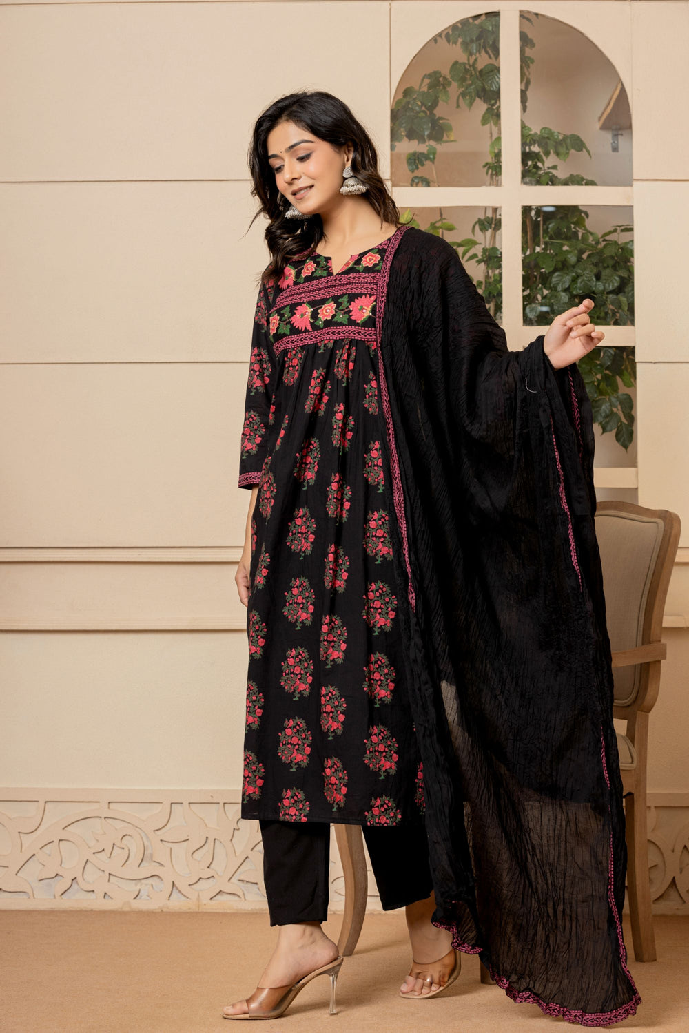 This Jet Black Mughal Cotton Suit Set will instantly bring sophistication to your look. This gorgeous piece features a simple dupatta, sheer embroidered neck work and is accented with soft pink block print flowers ensuring an alluring look!