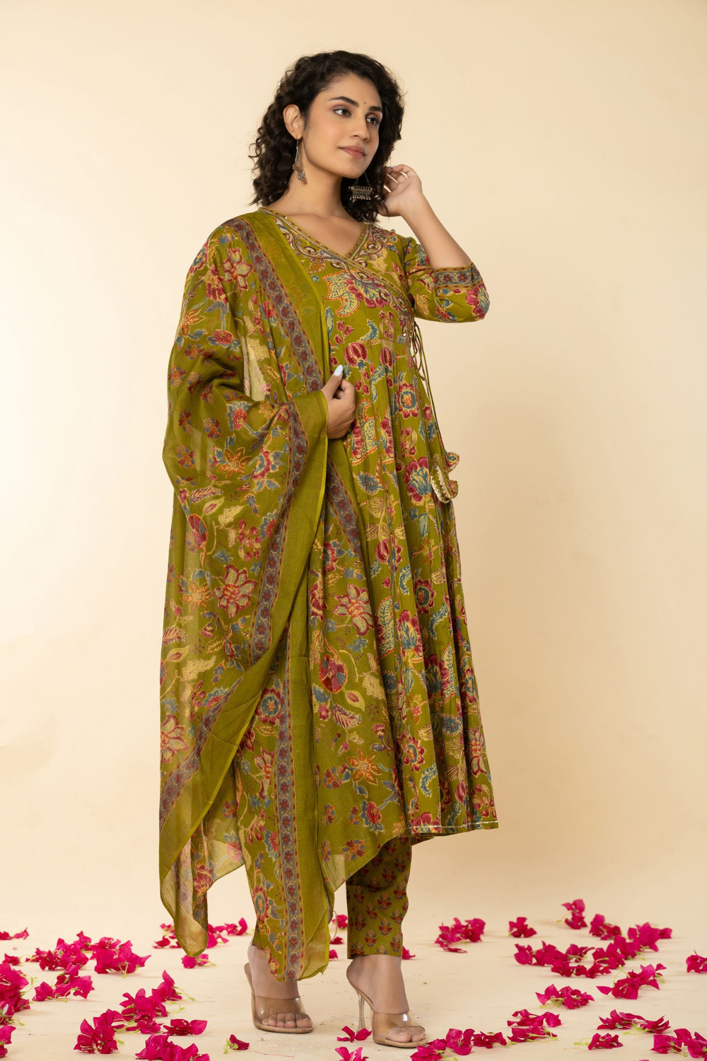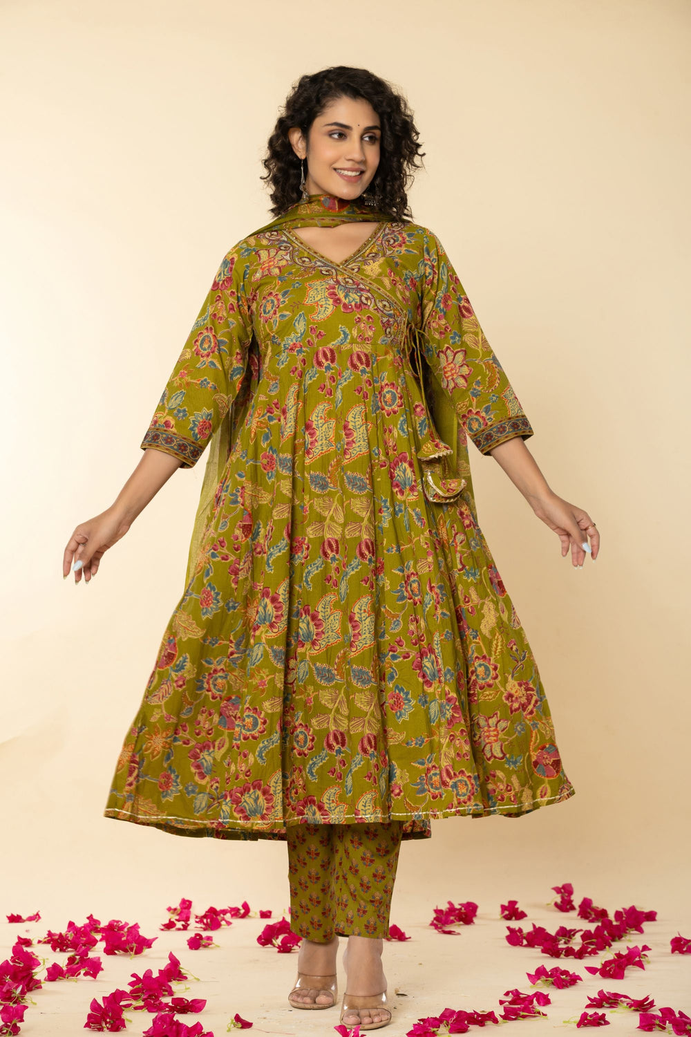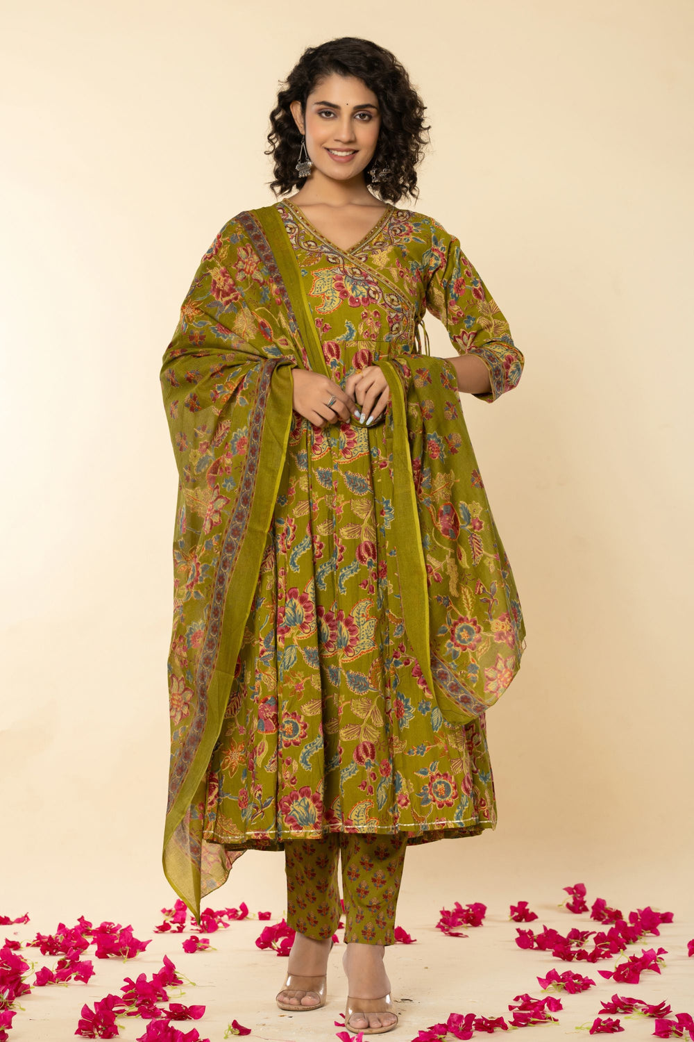 Introducing our exquisite Mehandi Green Angrakh Cotton Suit Set, a timeless ensemble that exudes elegance and grace. The V Neck style long kurta, crafted from delicate cotton fabric, showcases a charming Multi embroidery  accentuated by a classic V neck and 3/4 sleeves for a regal touch. Perfect for any occasion, from festive gatherings to formal events, this suit set promises to make you the epitome of grace and beauty wherever you go.