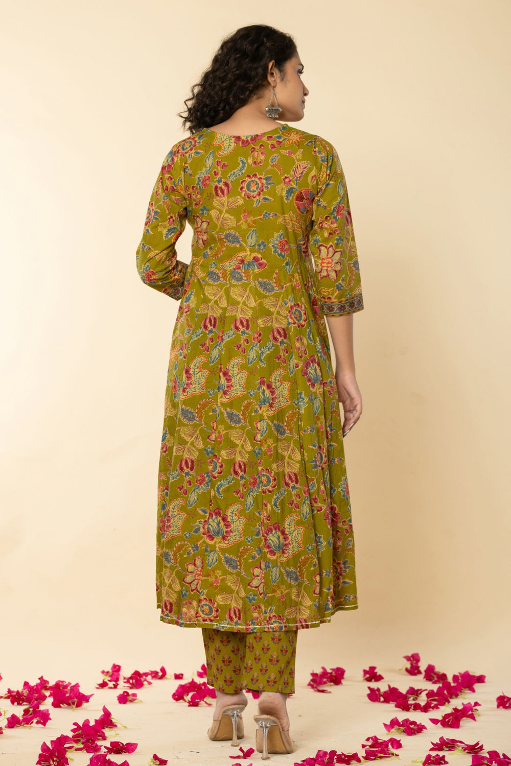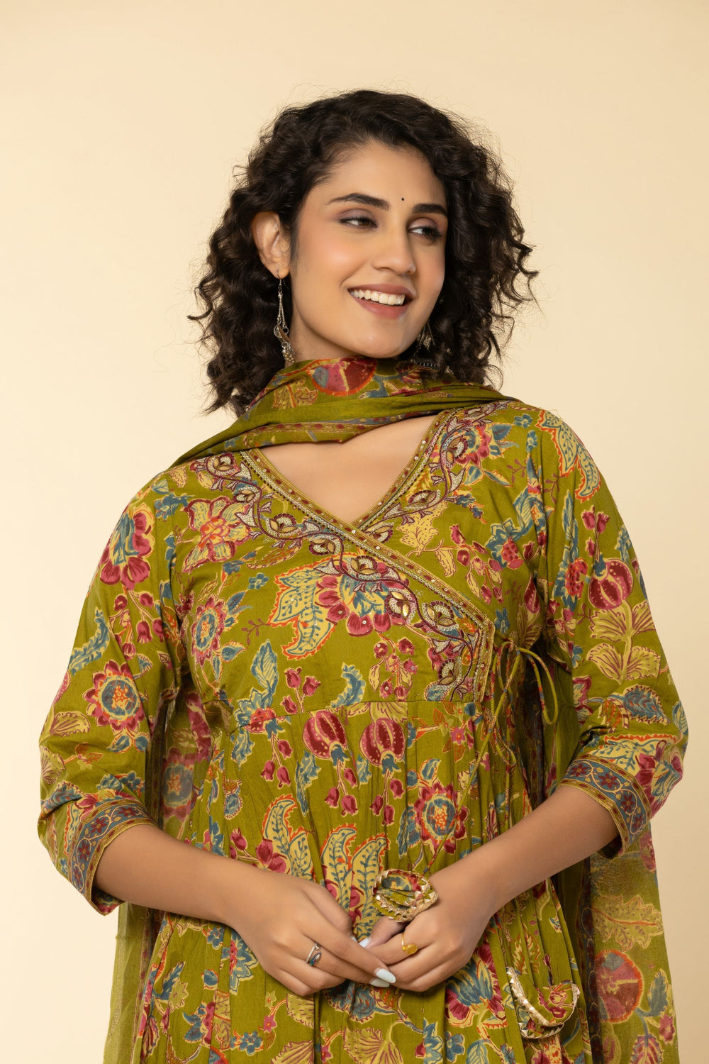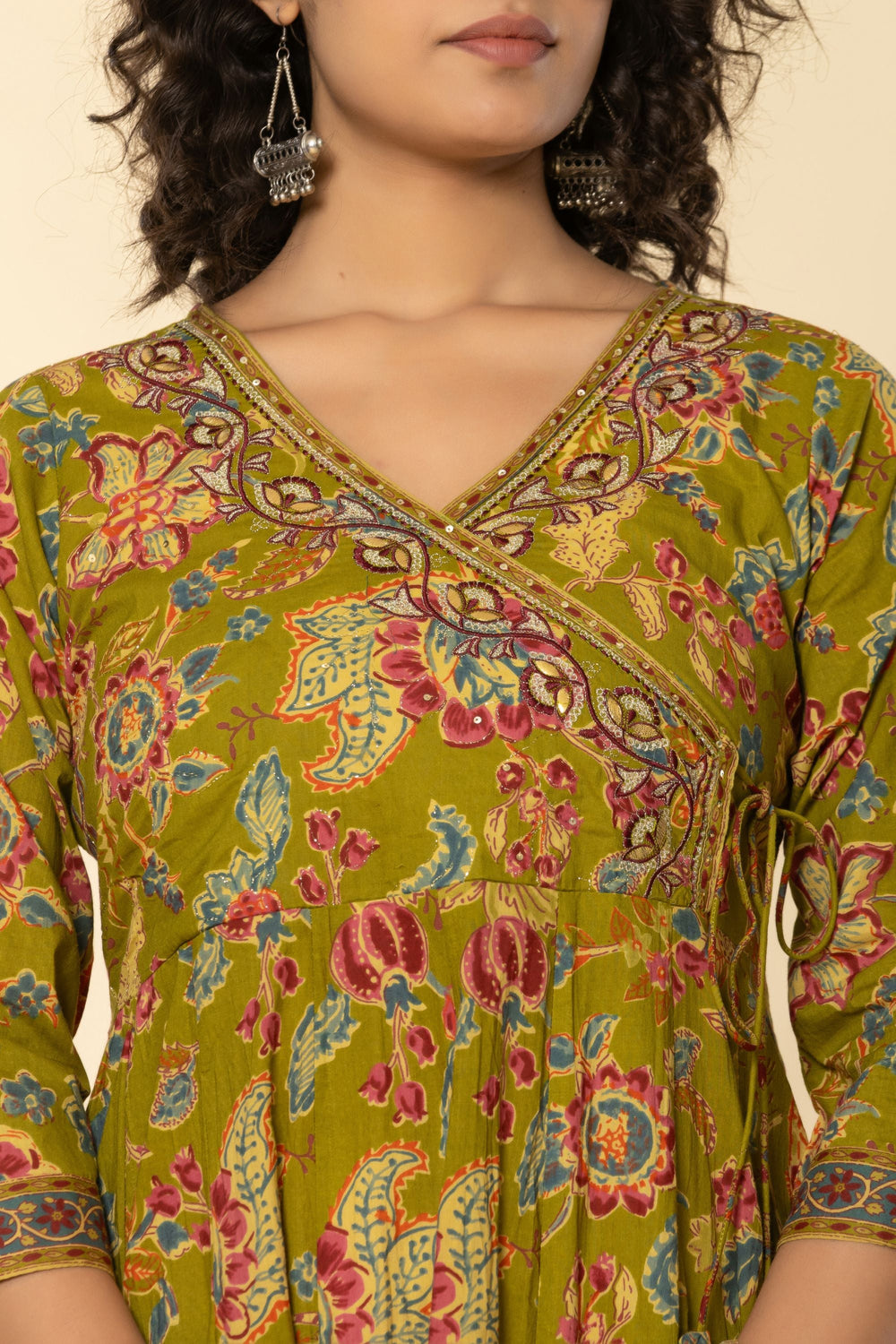 Introducing our exquisite Mehandi Green Angrakh Cotton Suit Set, a timeless ensemble that exudes elegance and grace. The V Neck style long kurta, crafted from delicate cotton fabric, showcases a charming Multi embroidery  accentuated by a classic V neck and 3/4 sleeves for a regal touch. Perfect for any occasion, from festive gatherings to formal events, this suit set promises to make you the epitome of grace and beauty wherever you go.