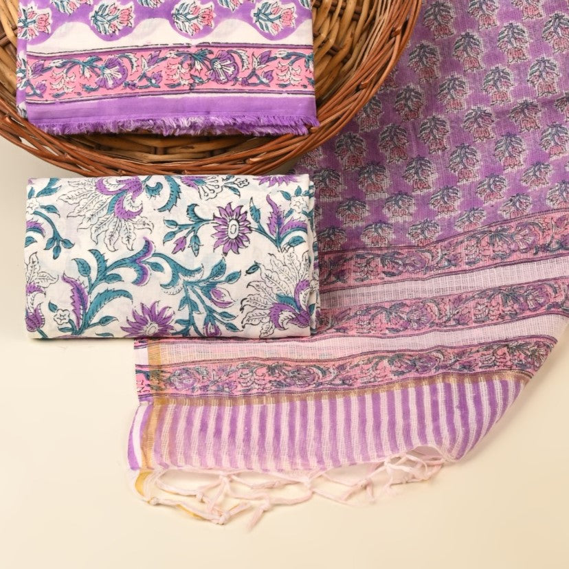 Purple Pure Kota Doria Dupatta Unstitched Suit Set