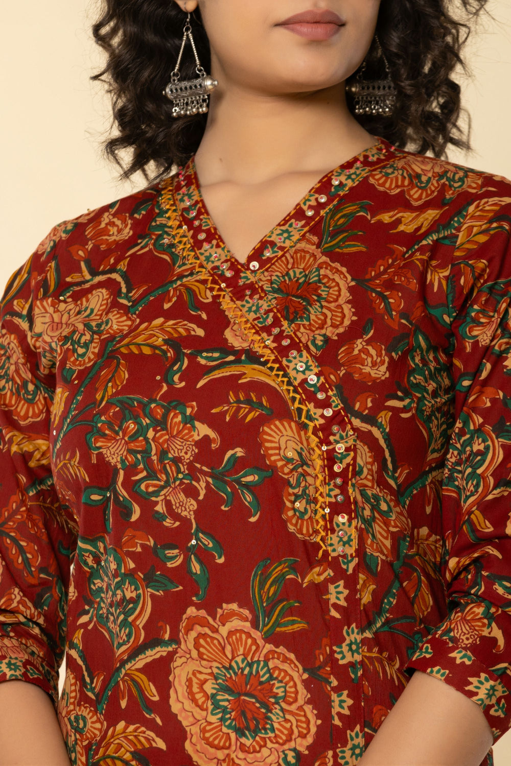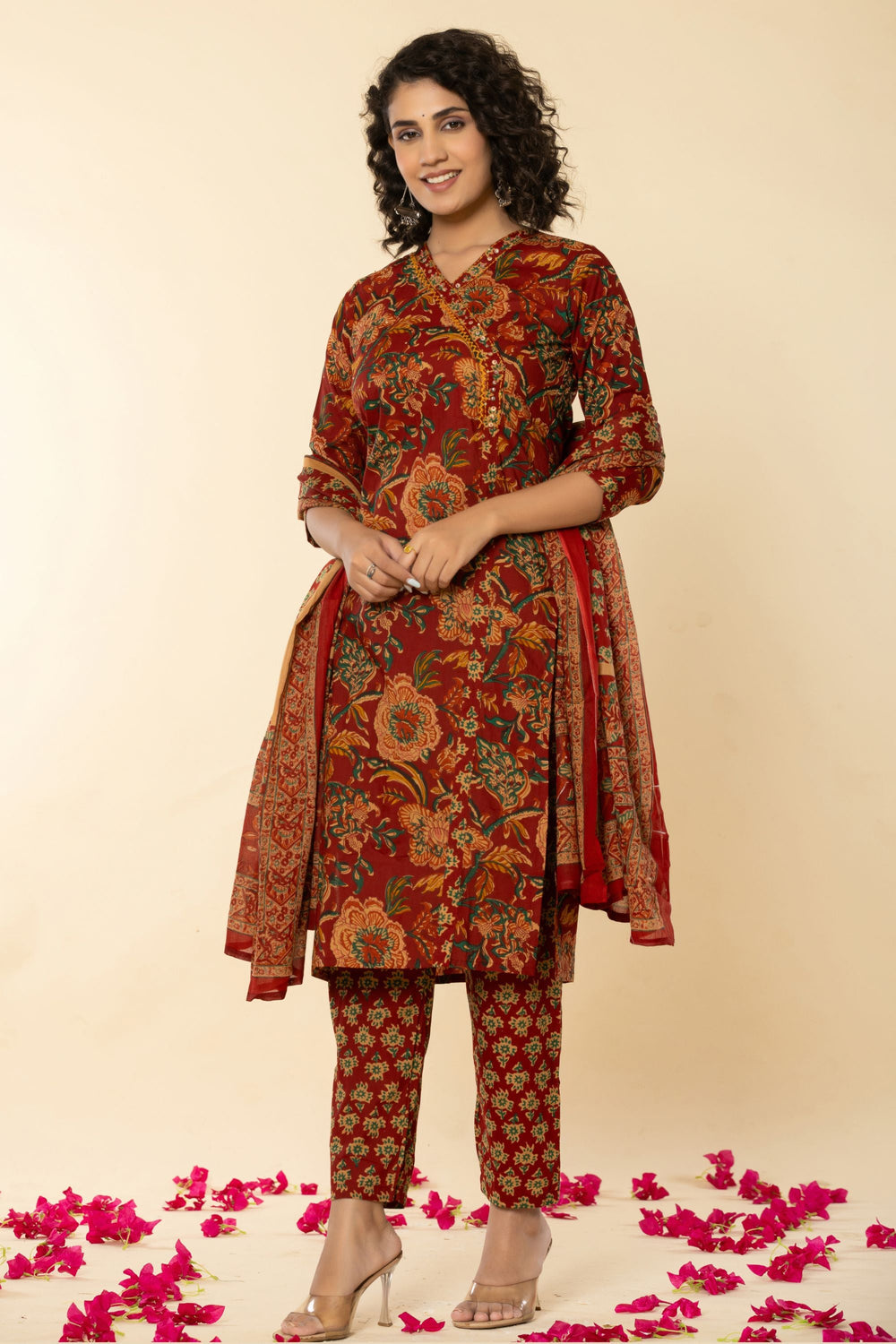 Elevate your style with our Rosewood Marron Kalamkari Cotton Suit Set, a radiant embodiment of elegance. Crafted from exquisite marron kalamkari Cotton fabric, this ensemble exudes a blend of sophistication and charm. The V neckline adds a touch of grace, and the cotton dupatta completes the look