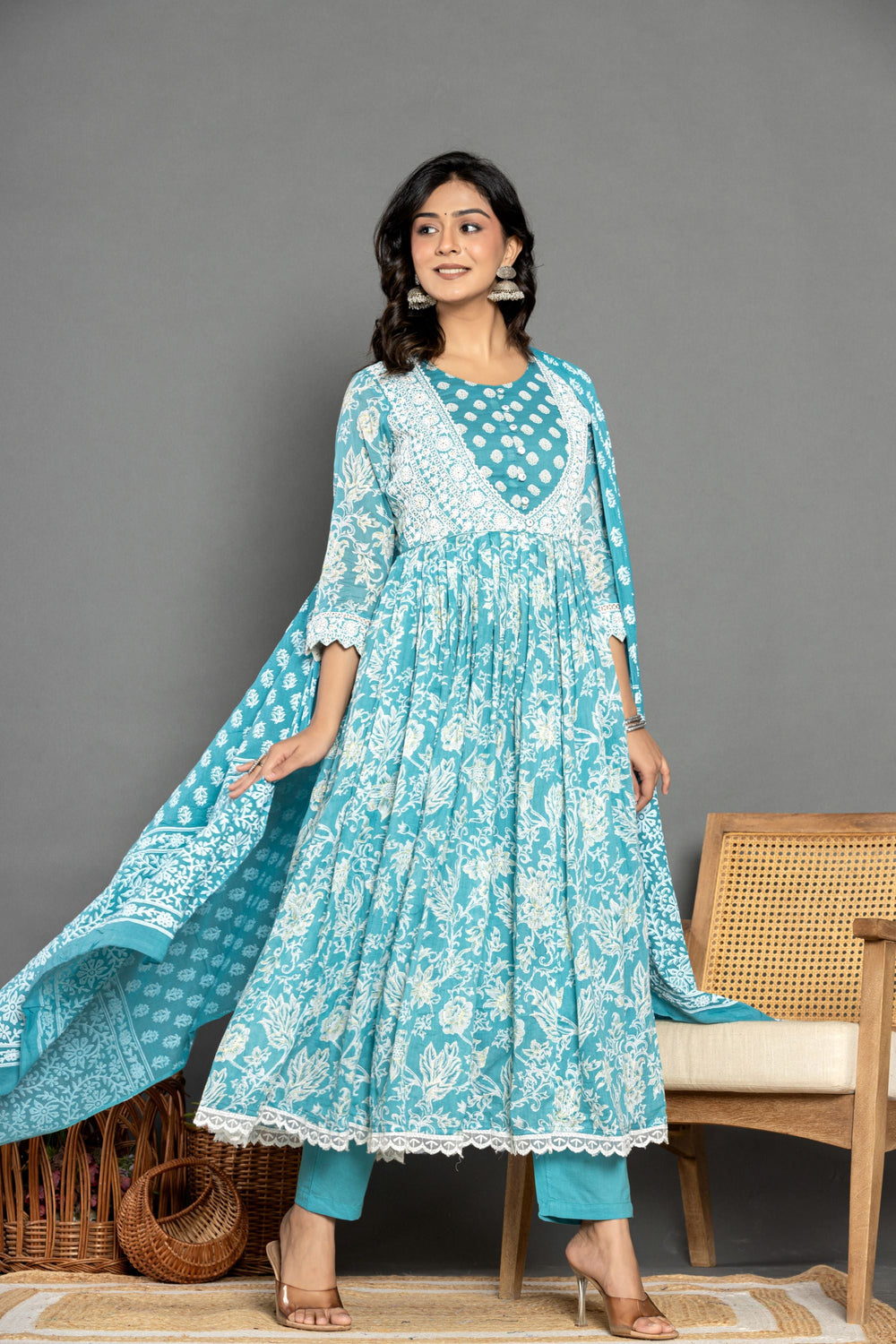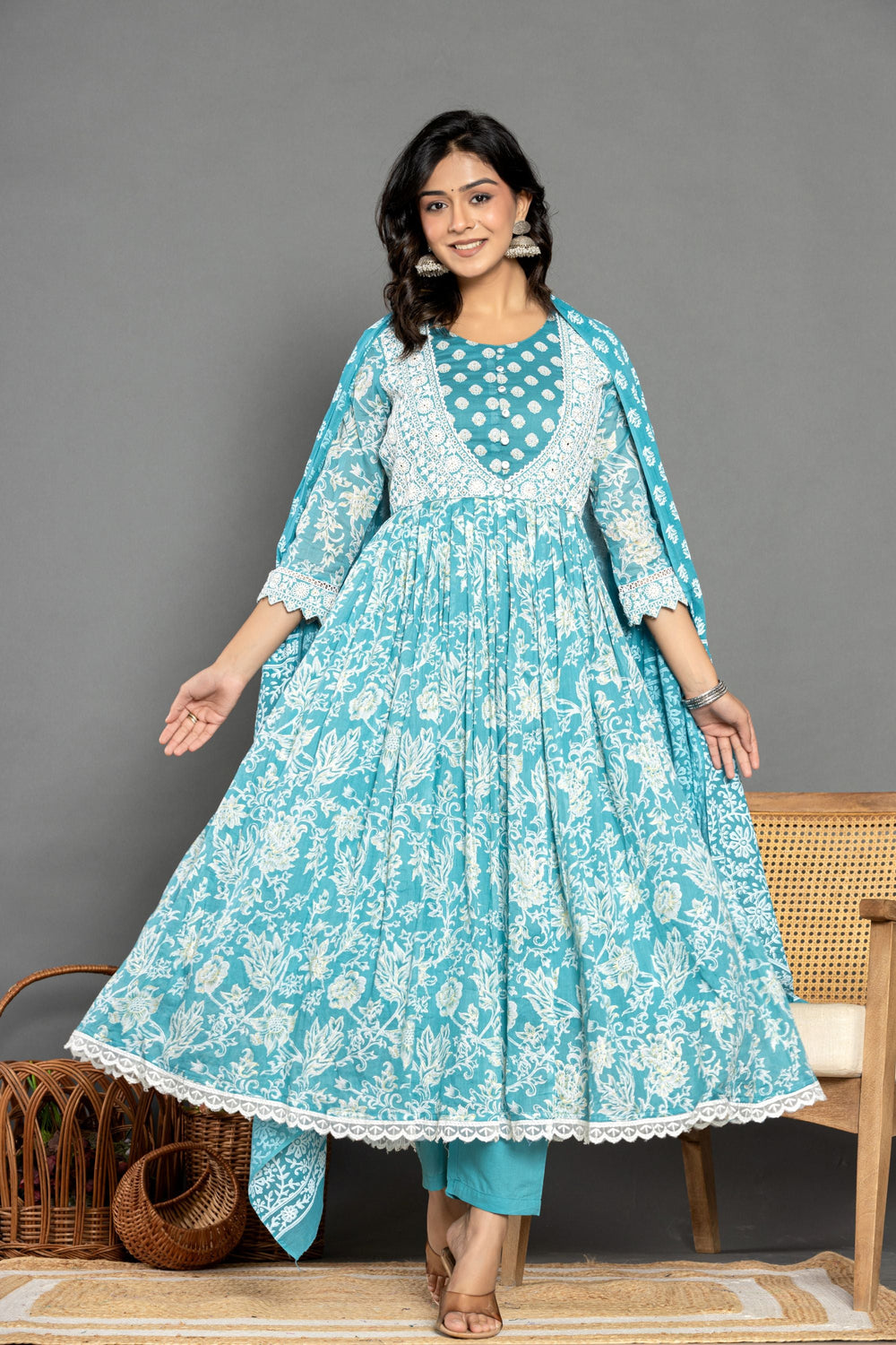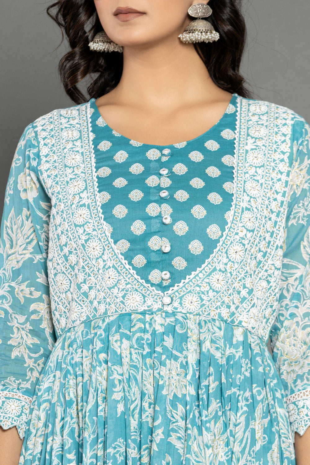 Introducing the Sea Green Long Cotton Suit Set, a stunning blend of elegance and comfort. Crafted from luxurious mul cotton, its gorgeous sea green hues shine brightly. The Long pattern yoke with button detailing, three-quarter length sleeves, and flared hemline add sophistication. Paired with matching pants and a floral printed dupatta, this ensemble effortlessly combines timeless charm with modern style.
