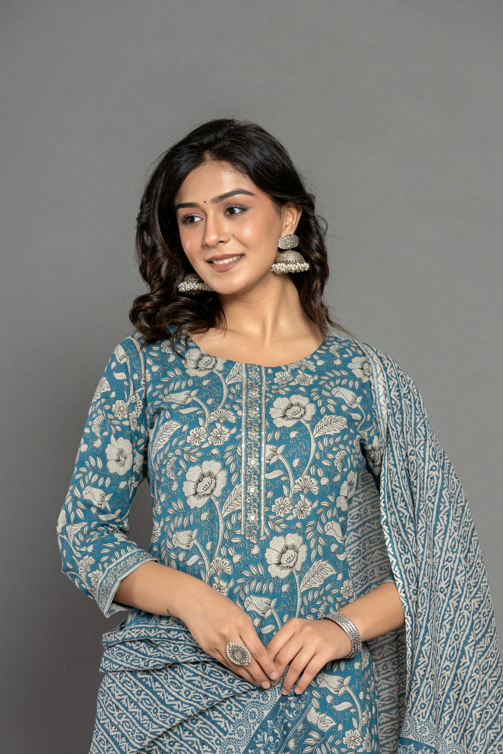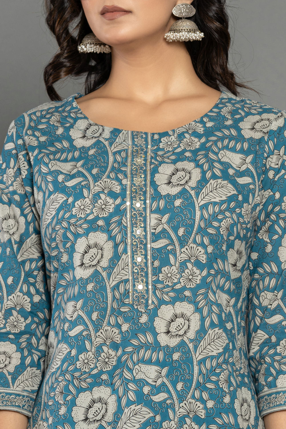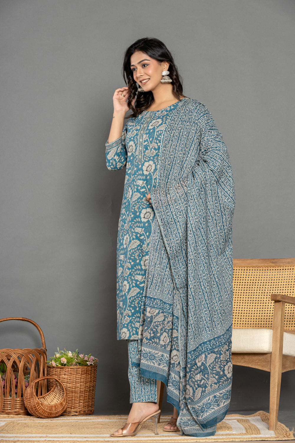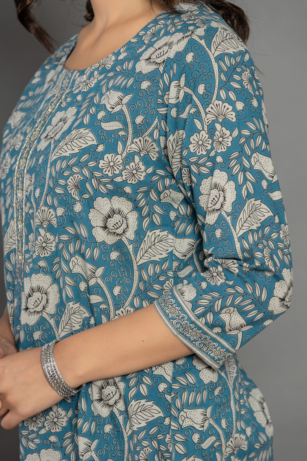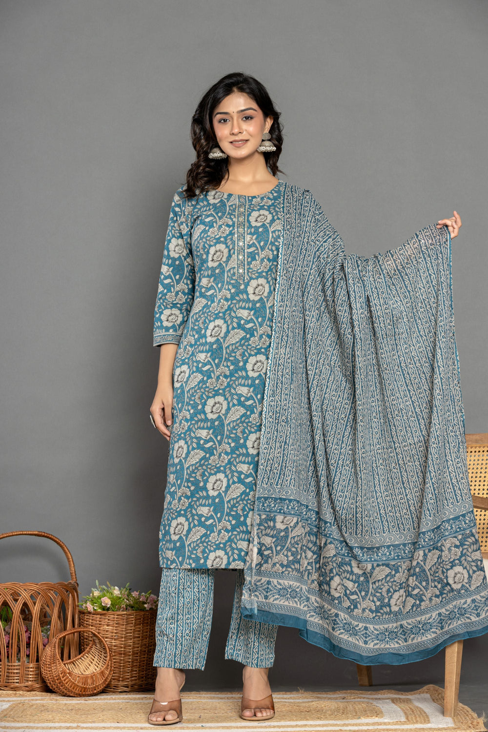 The Teal Blue Floral Cotton Suit Set in a beautiful hue of blue makes you look gorgeous feeling blushed from inside just like the blooming flowers of lilly.