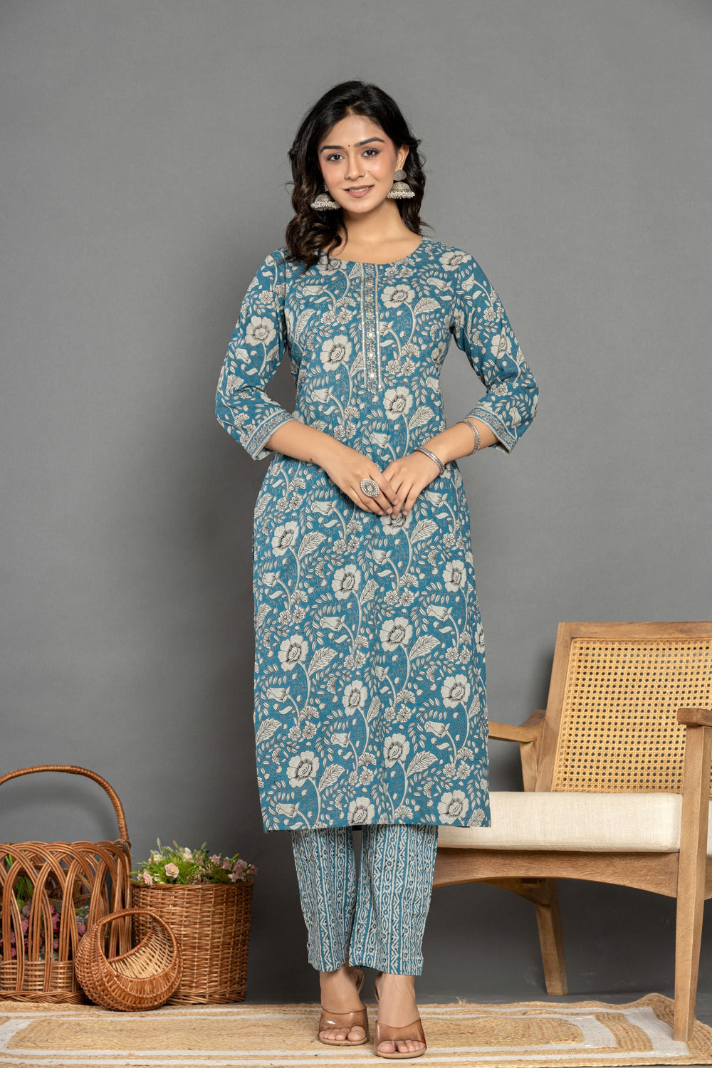 Teal Blue Floral Cotton Suit Set
