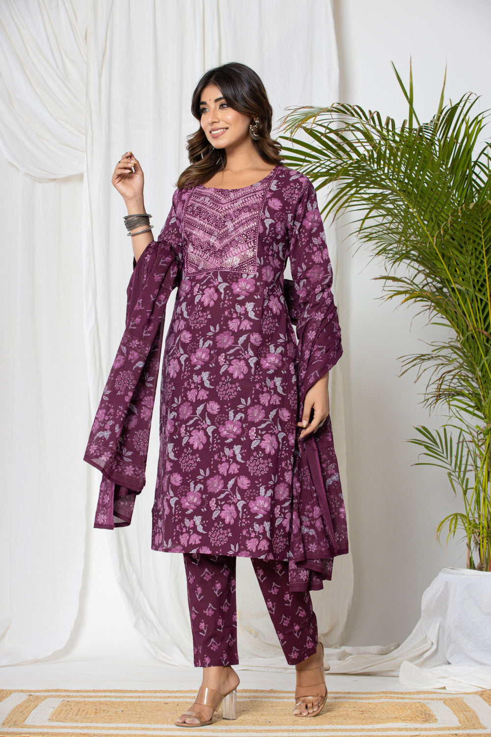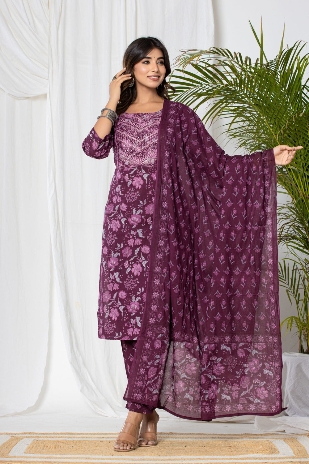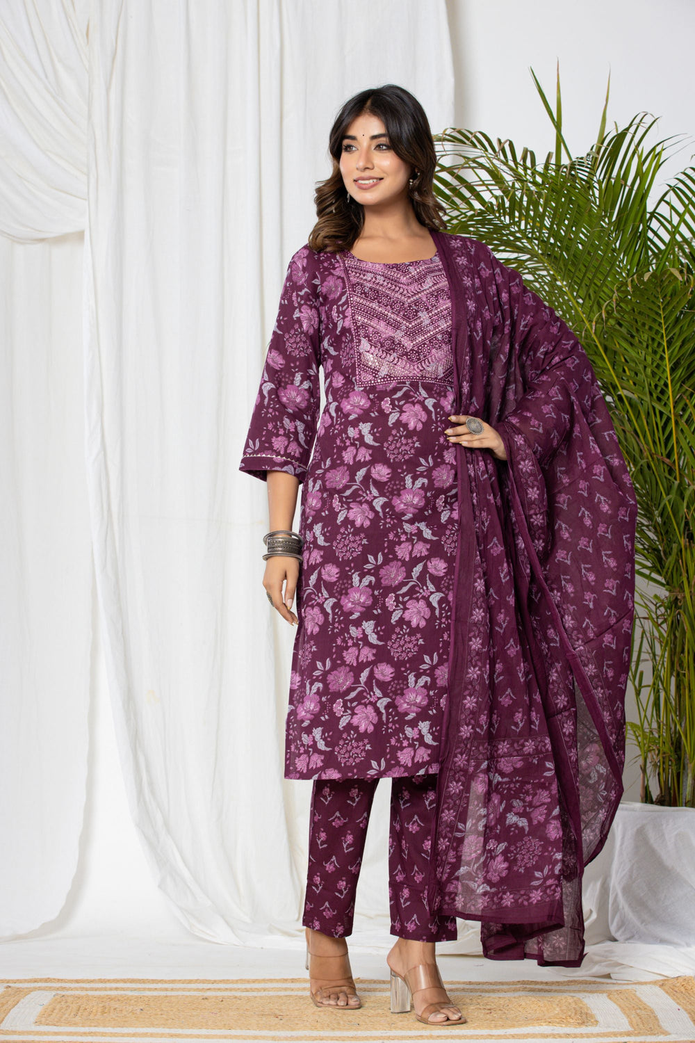Our Wine Floral Cotton Suit Set is an exquisite ensemble crafted from luxurious wine-coloured cotton fabric and accompanying cotton dupatta. This set exudes elegance and sophistication with its rich, deep hue. The highlight of this ensemble is the meticulously crafted thread work that adds a touch of glamour and sparkle, making it perfect for office wear.