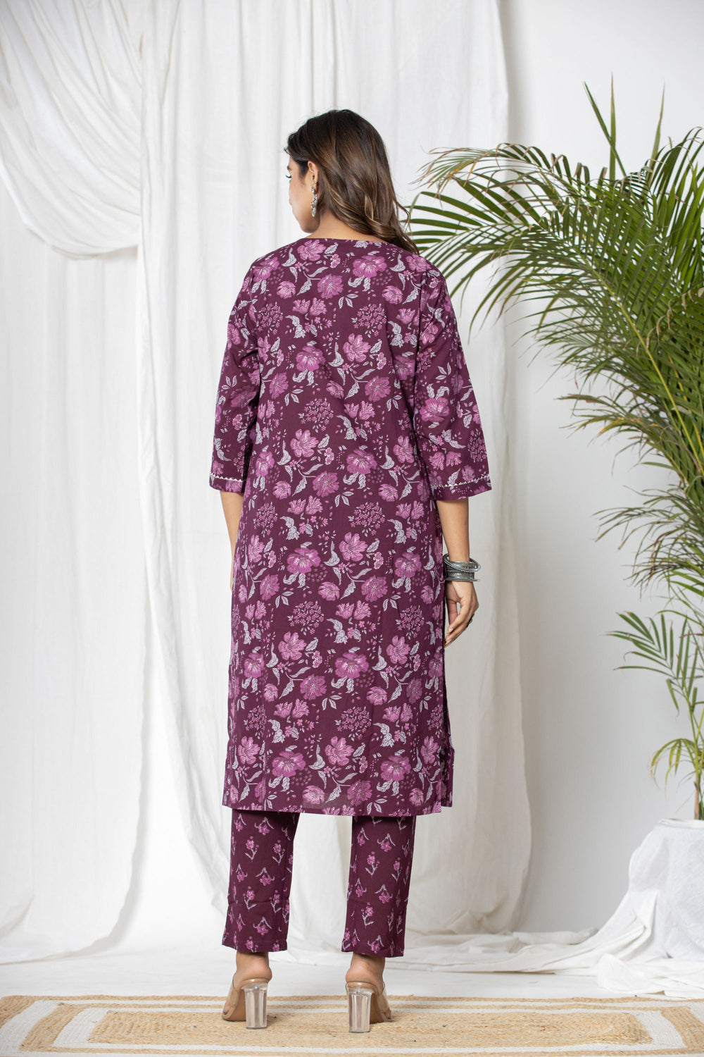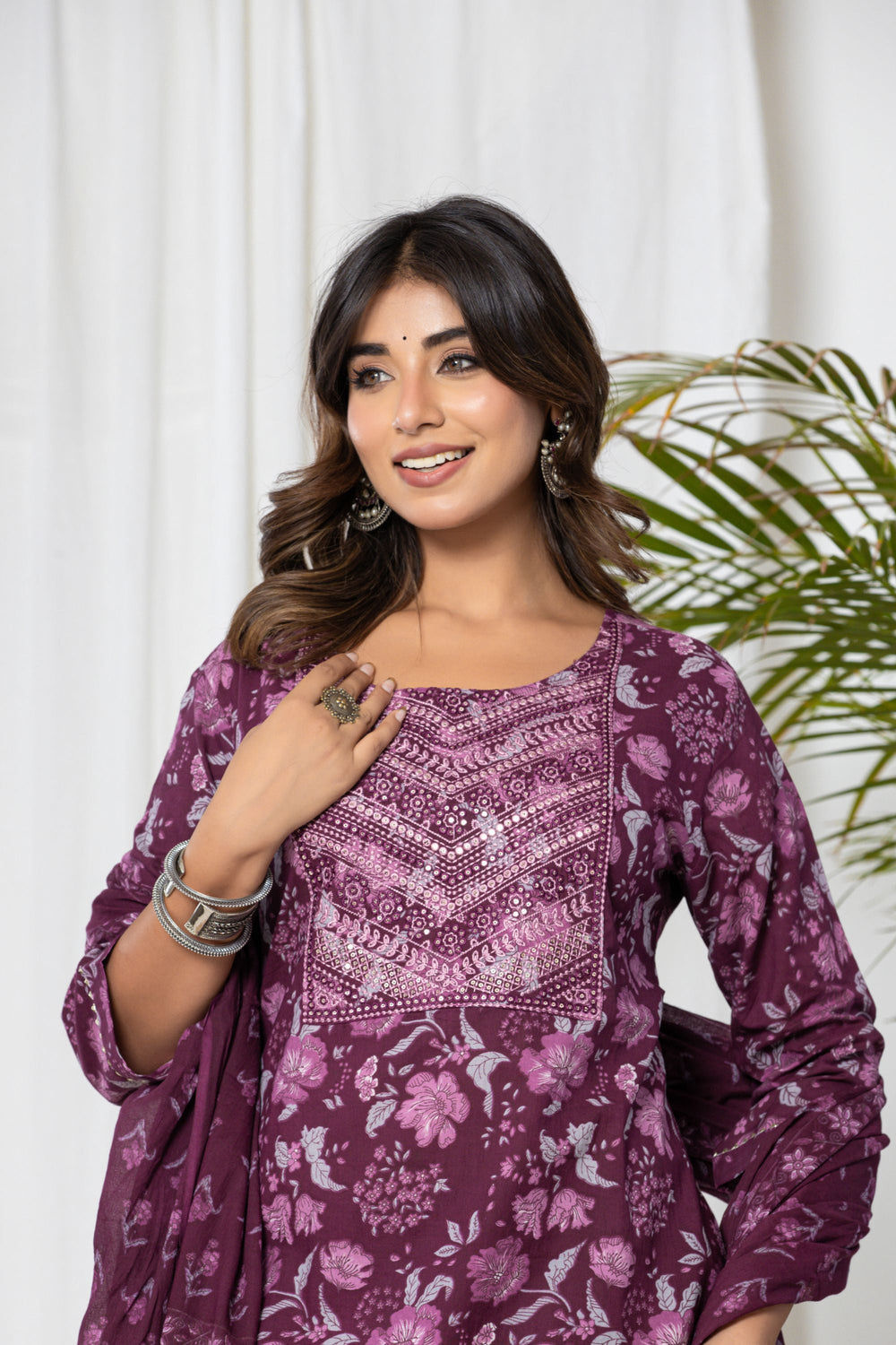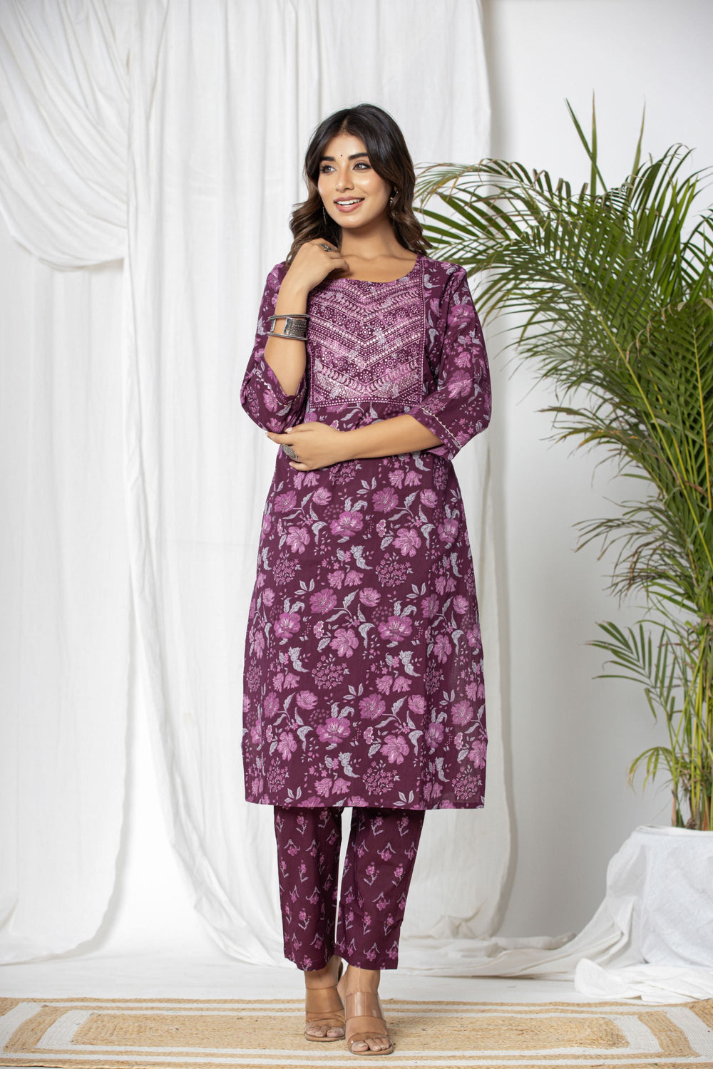 Our Wine Floral Cotton Suit Set is an exquisite ensemble crafted from luxurious wine-coloured cotton fabric and accompanying cotton dupatta. This set exudes elegance and sophistication with its rich, deep hue. The highlight of this ensemble is the meticulously crafted thread work that adds a touch of glamour and sparkle, making it perfect for office wear.
