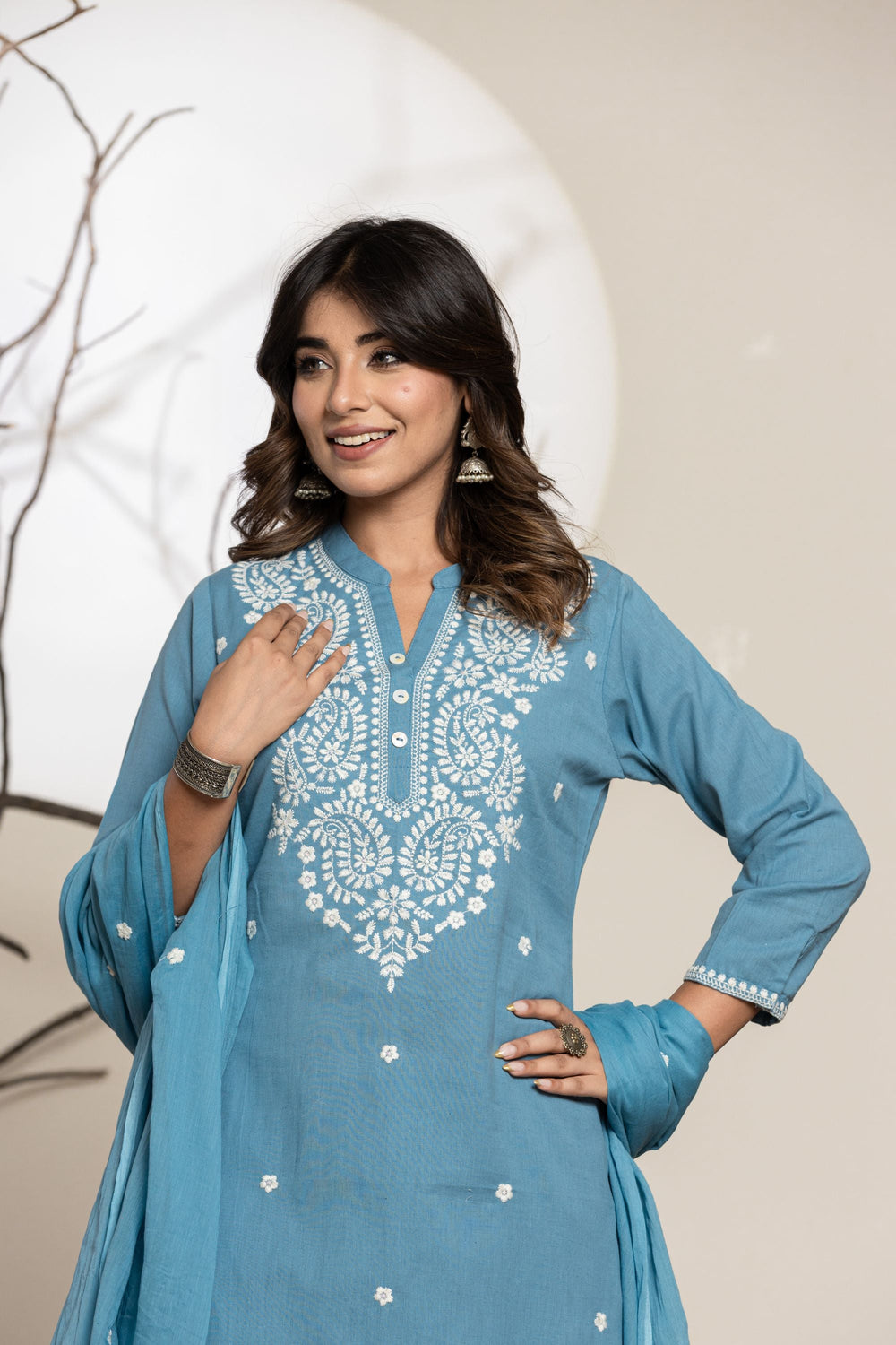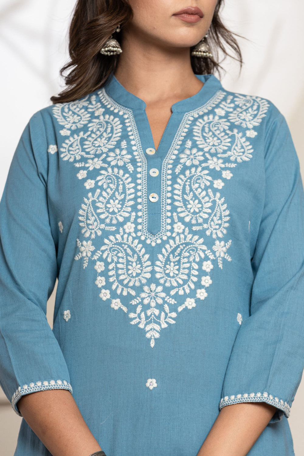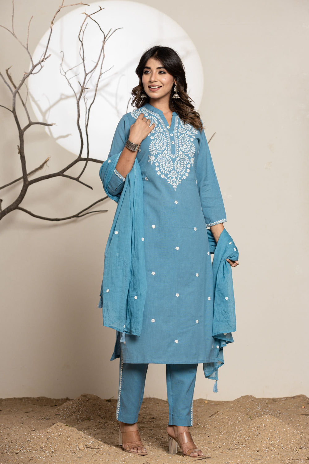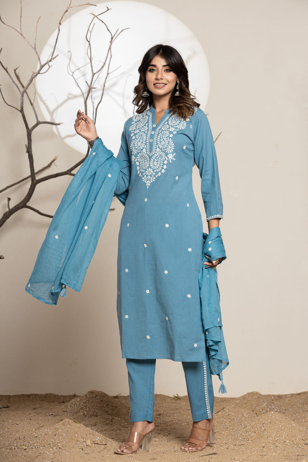 This Aegan Blue Linen Suit Set will be your favourite go-to look. The embroidery work across the neck and pant gives it a unique touch, and the fit really makes it stand out. Pair it with some jhumkas to give it the perfect indo-western look!