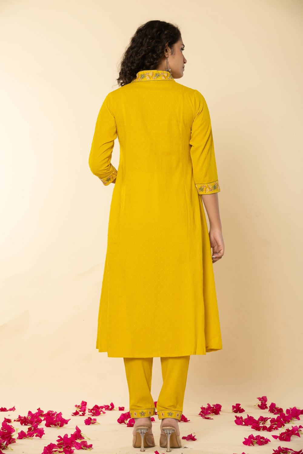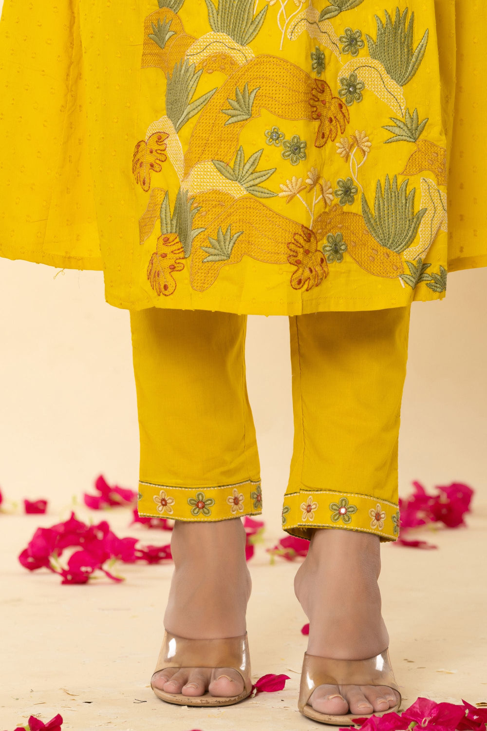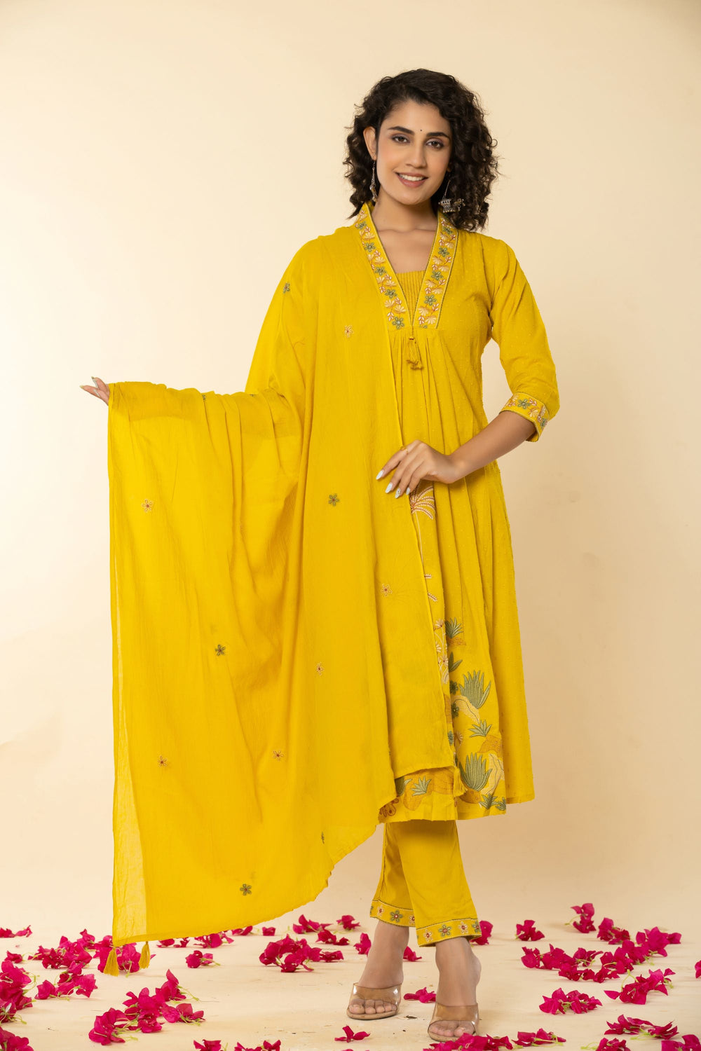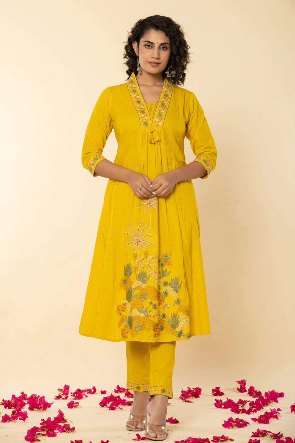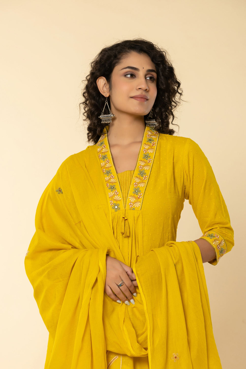 Elevate your style with our Canary Yellow Cotton Doby Suit Set, a radiant embodiment of elegance. Crafted from exquisite yellow embroidered Cotton fabric, this ensemble exudes a blend of sophistication and charm. The V neckline adds a touch of grace, and the cotton dupatta completes the look