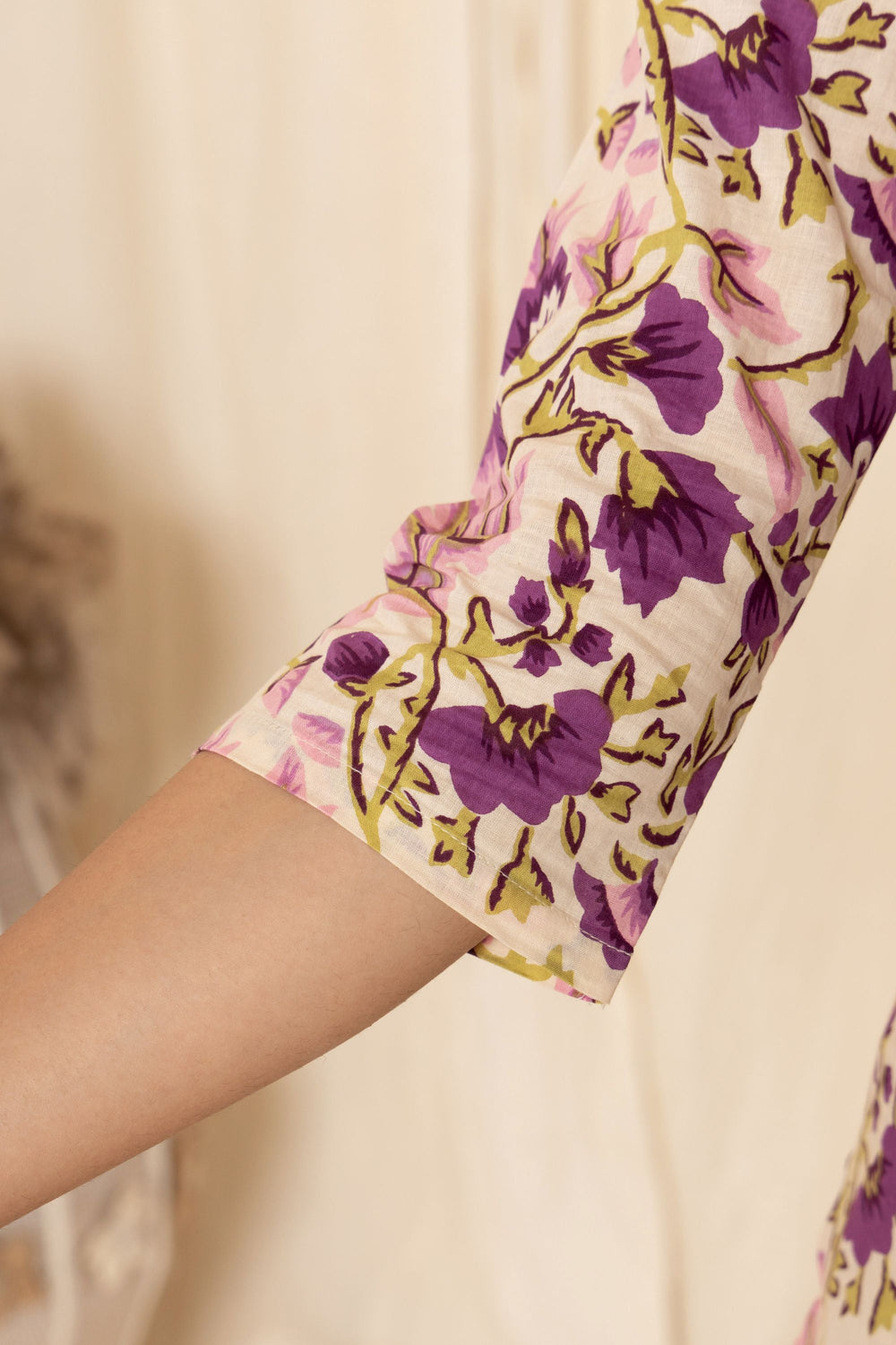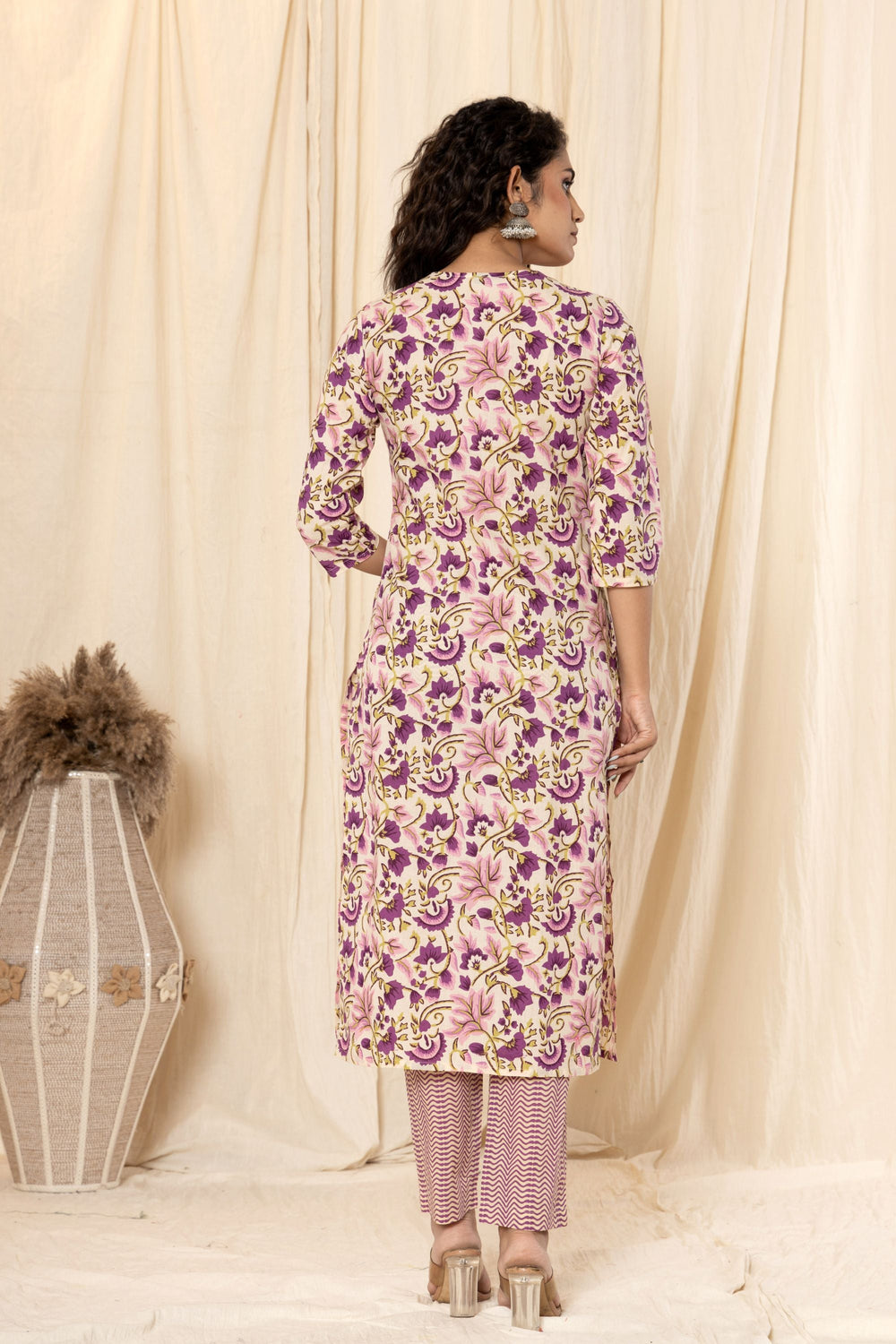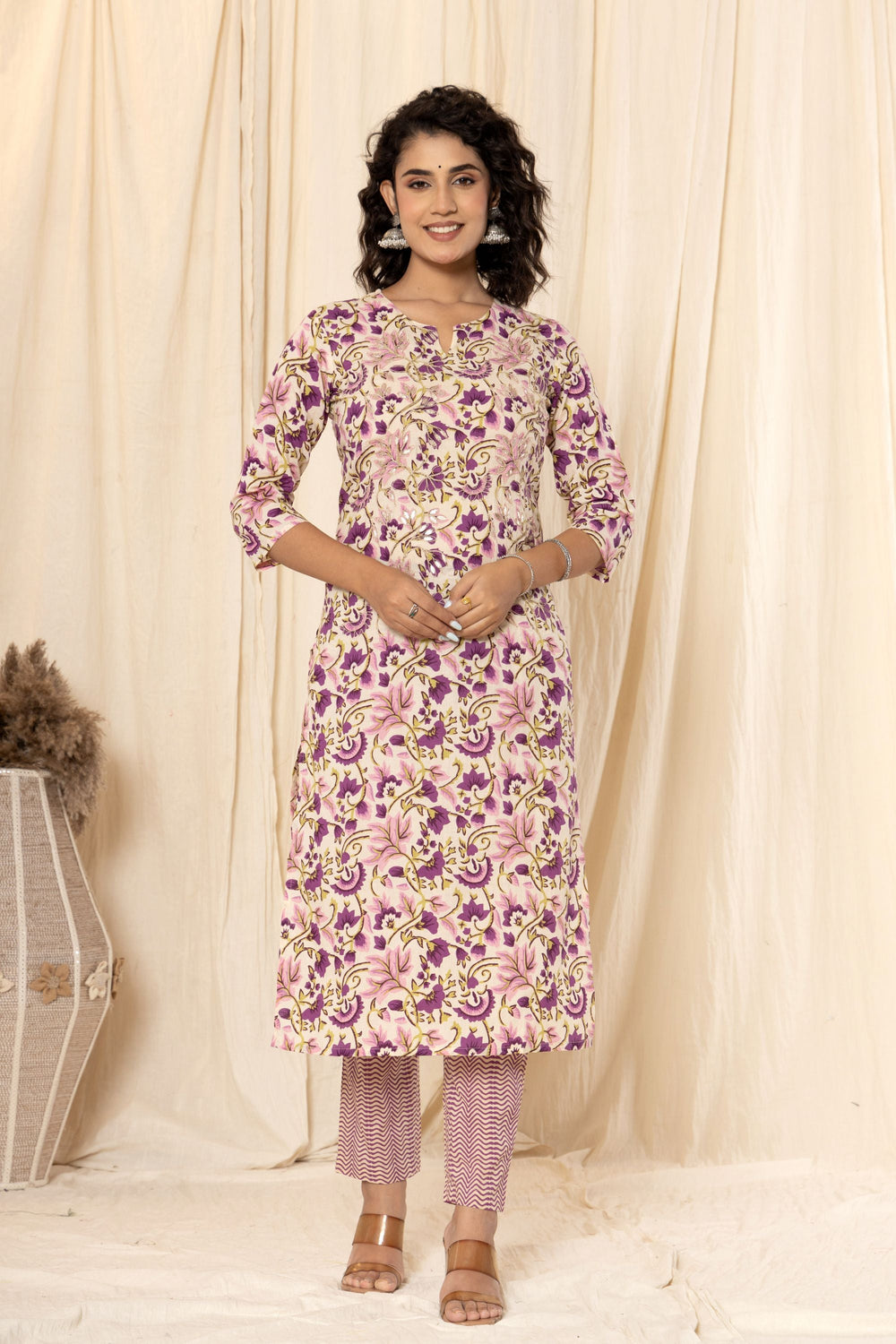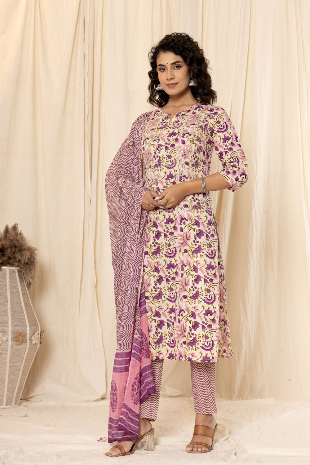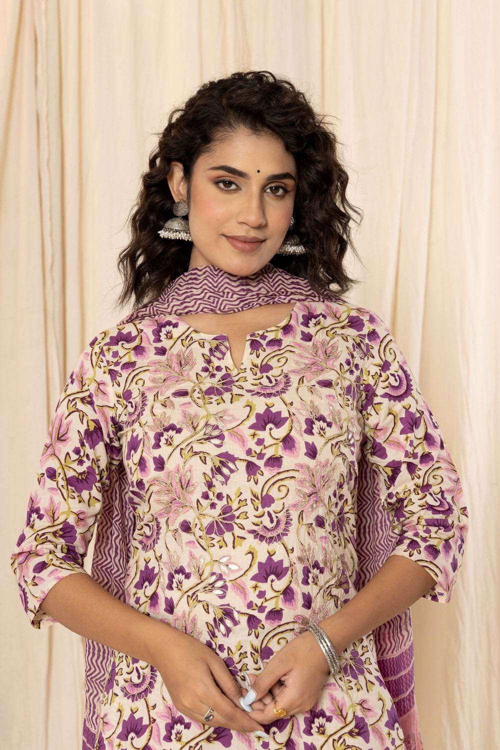 Step into elegance with the Chiffony Cream Block Print Cotton Suit Set in cream! This straight fit kurta flaunts agota patti work on the front. With three-quarter sleeves , it pairs perfectly with comfy pants and a mul mul cotton dupatta. A fun, festive must-have for your wardrobe!