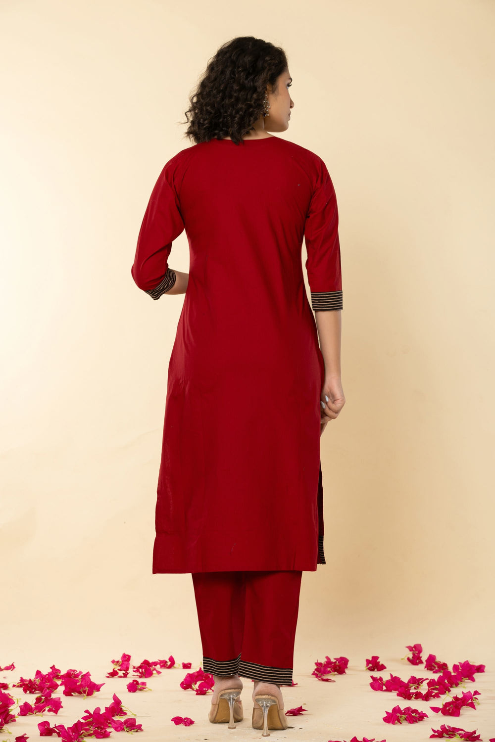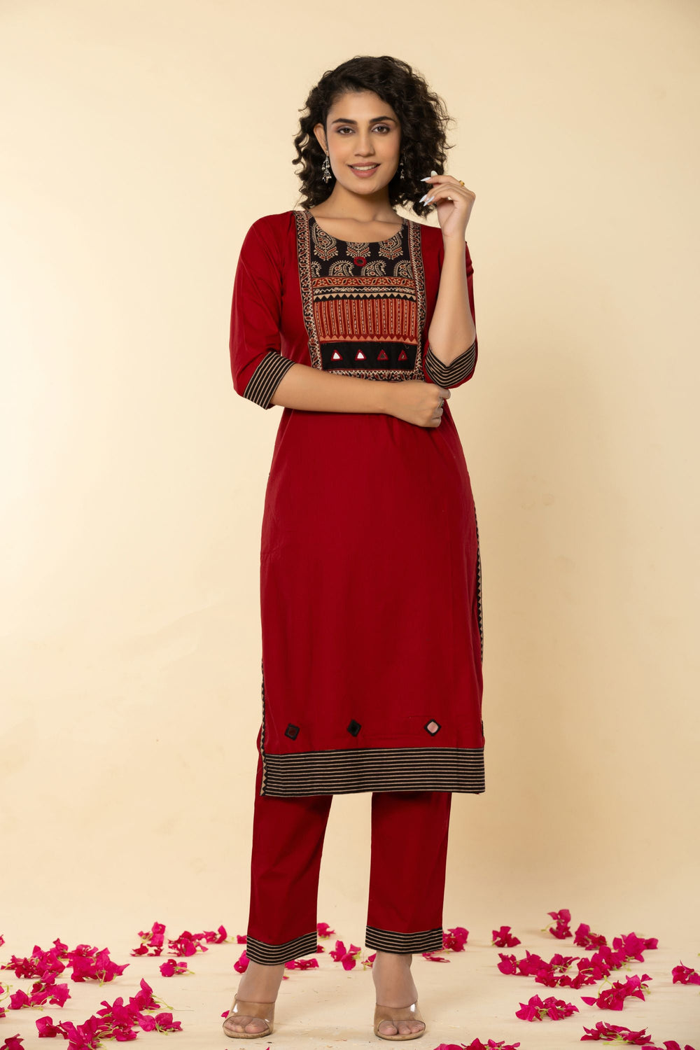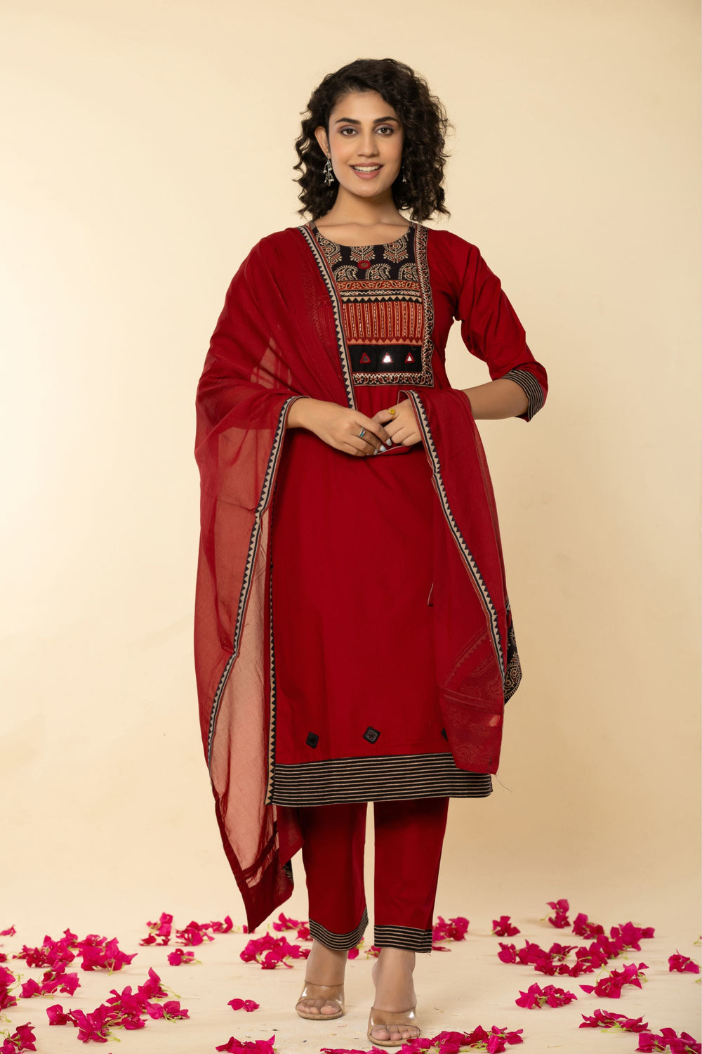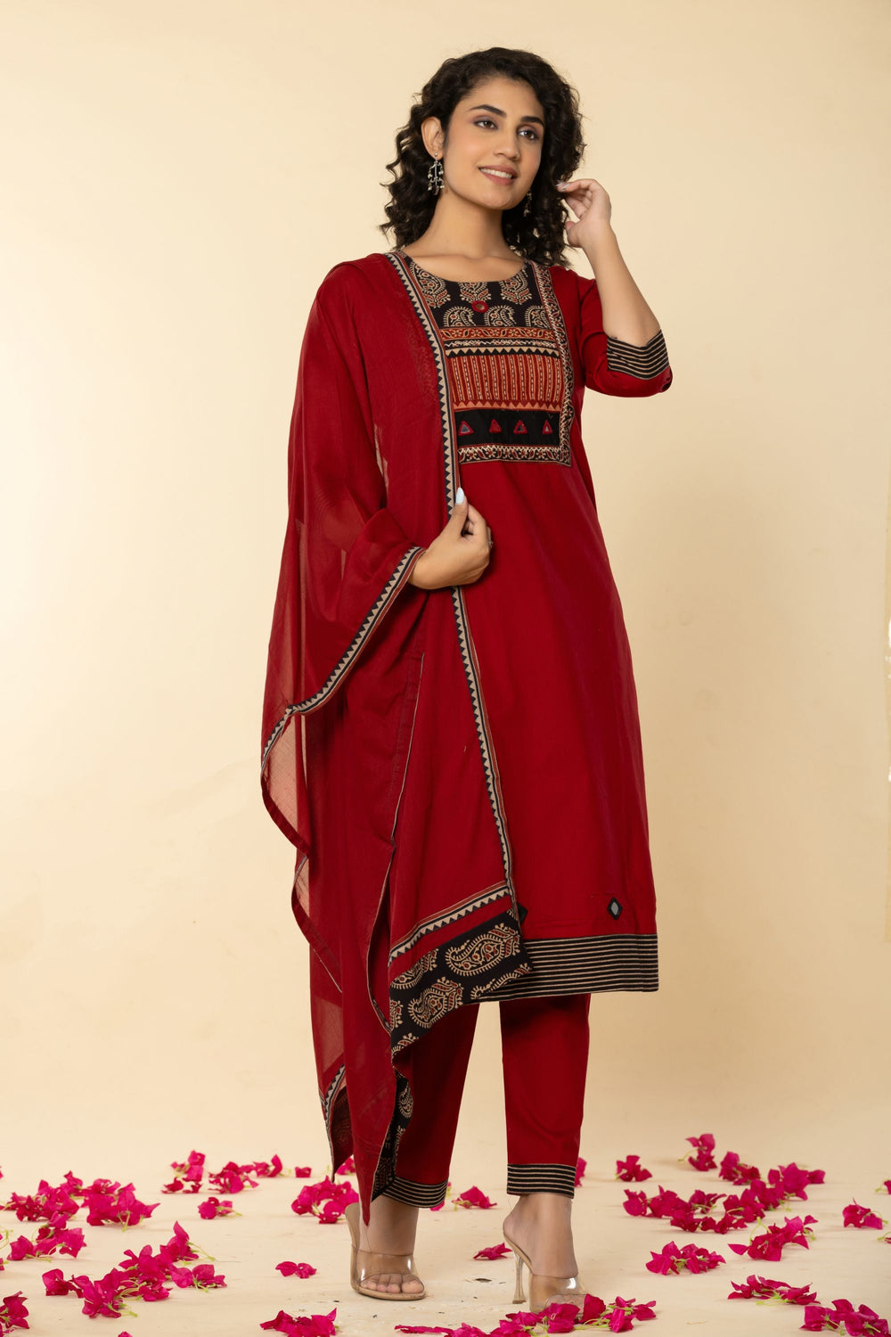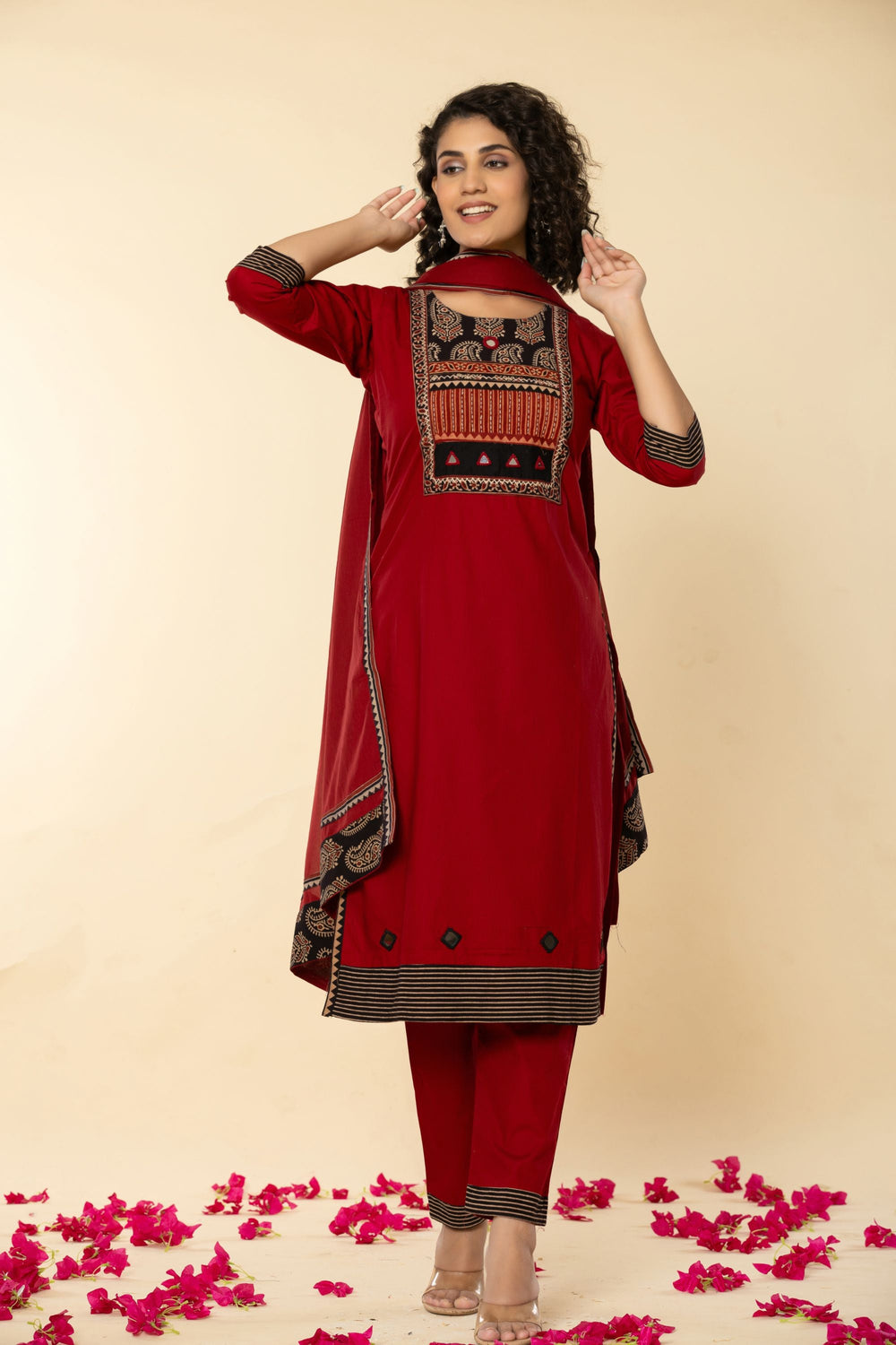 Step into elegance with the Exicuit Marron Gujrati Suit Set Crafted from the finest cotton in stunning marron hues, this set features a relxed fit straight kurta with exquisite hand block prints and a square neck with a notch. The fringe lace on the yoke adds a chic touch, complemented by three-quarter sleeves. Paired with contrasting plain dupatt , it’s the perfect blend of comfort and sophistication for any occasion.